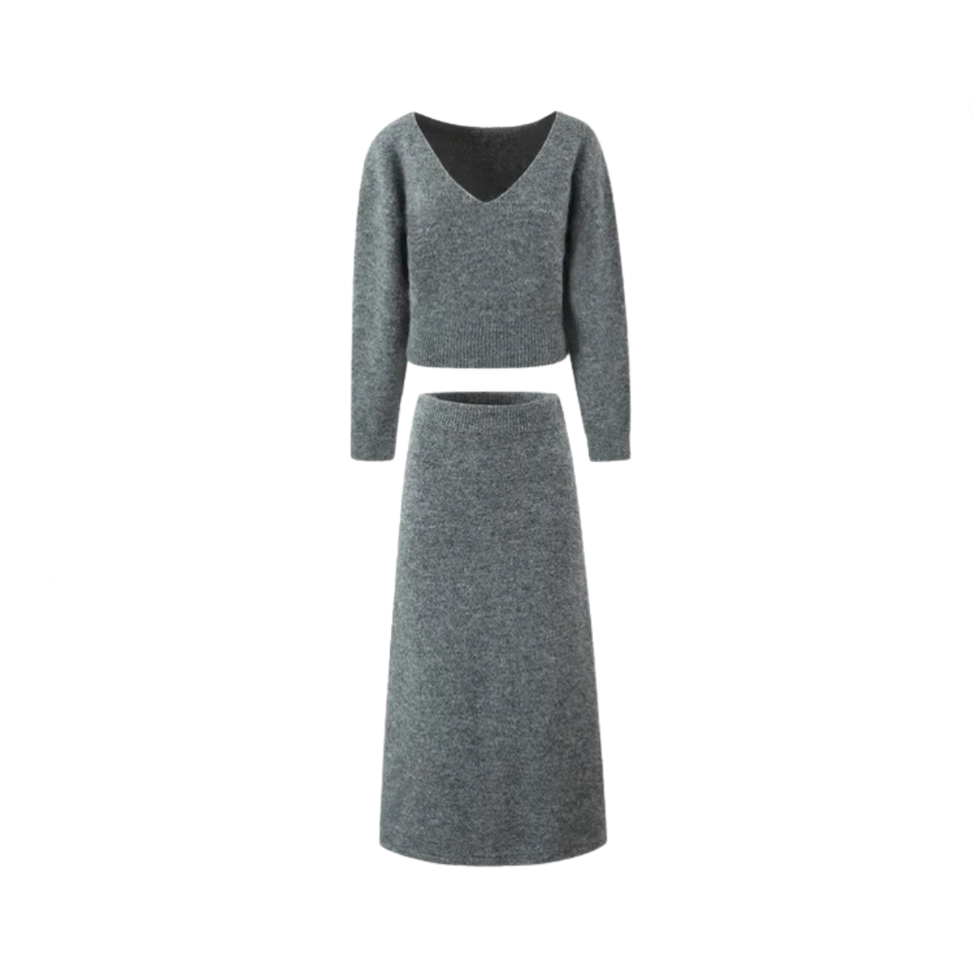 Experience the perfect blend of style and comfort with our Grey V-Neck Knitted Pullover + Skirt Set. This versatile set is designed with a classic v-neckline and a knitted fabric for a cozy and chic look.