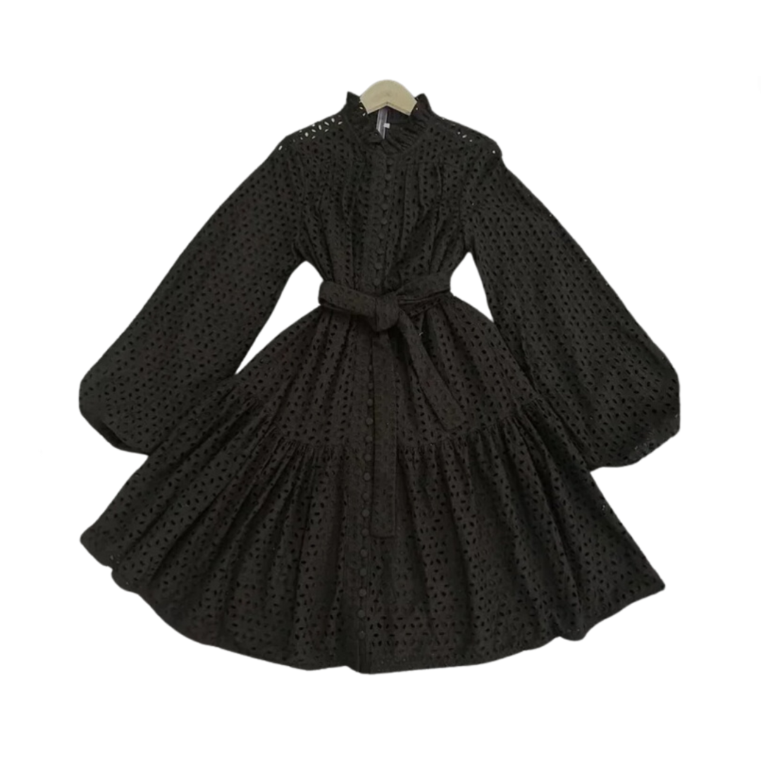 Upgrade your wardrobe with our Hollow Out Lantern Sleeve Tie Waist A-Line Dress. Featuring lantern sleeves and a flattering A-line silhouette with a tie waist. this dress is both stylish and comfortable.