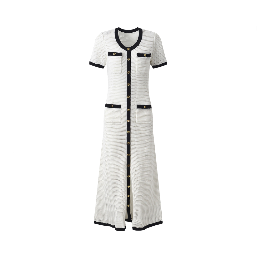 Featuring a round neck and short sleeves. this dress is both comfortable and chic. The hollowed out knit design adds a touch of uniqueness to this classic silhouette.