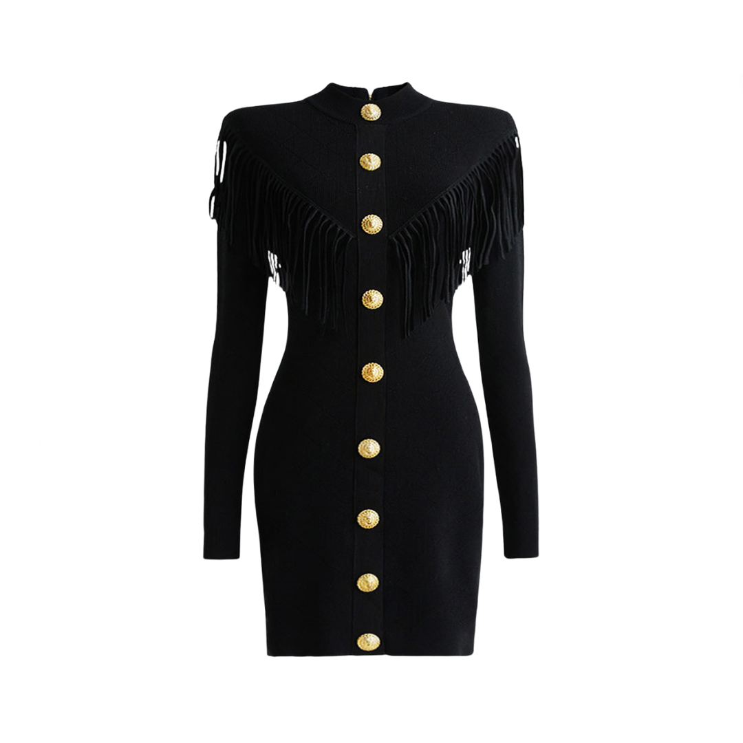 This knitted dress boasts a flattering v-neckline. slim fit design. and elegant tassel details. Perfect for any occasion. the long sleeves add warmth while the slim fit accentuates your curves.