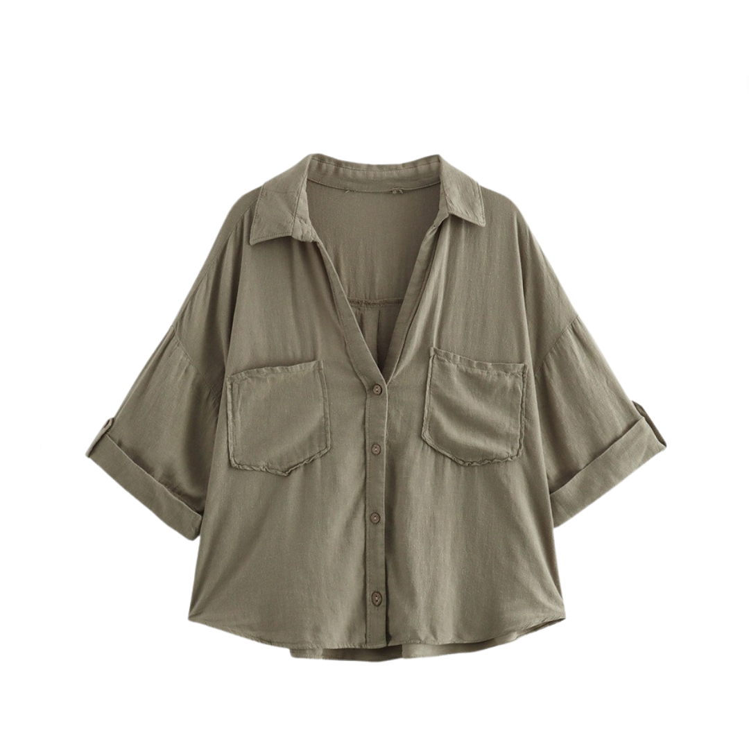 Expertly crafted with a linen blend. this casual short shirt offers a comfortable and stylish option for everyday wear. With its convenient front pockets. it provides both functionality and fashion.
