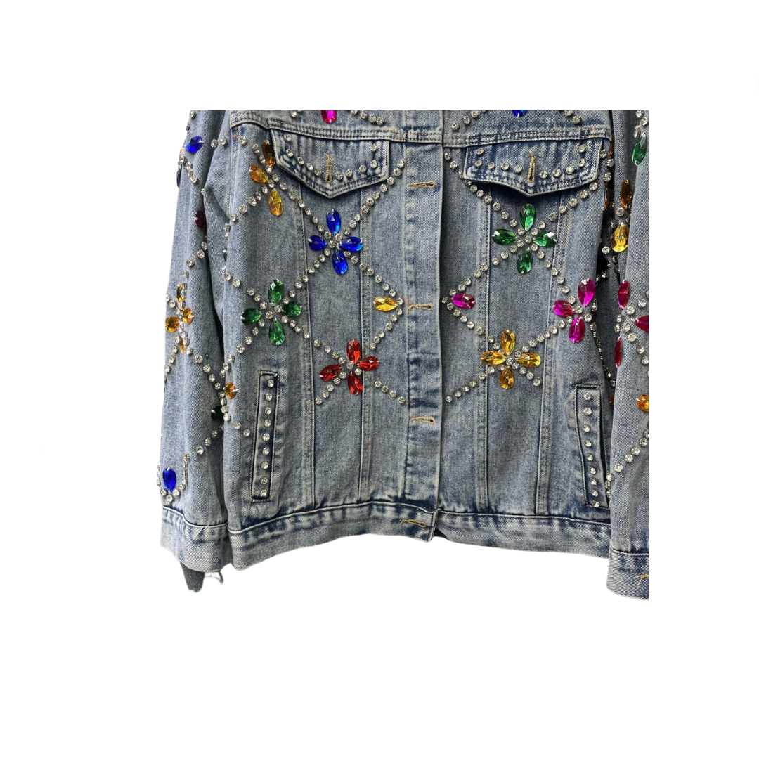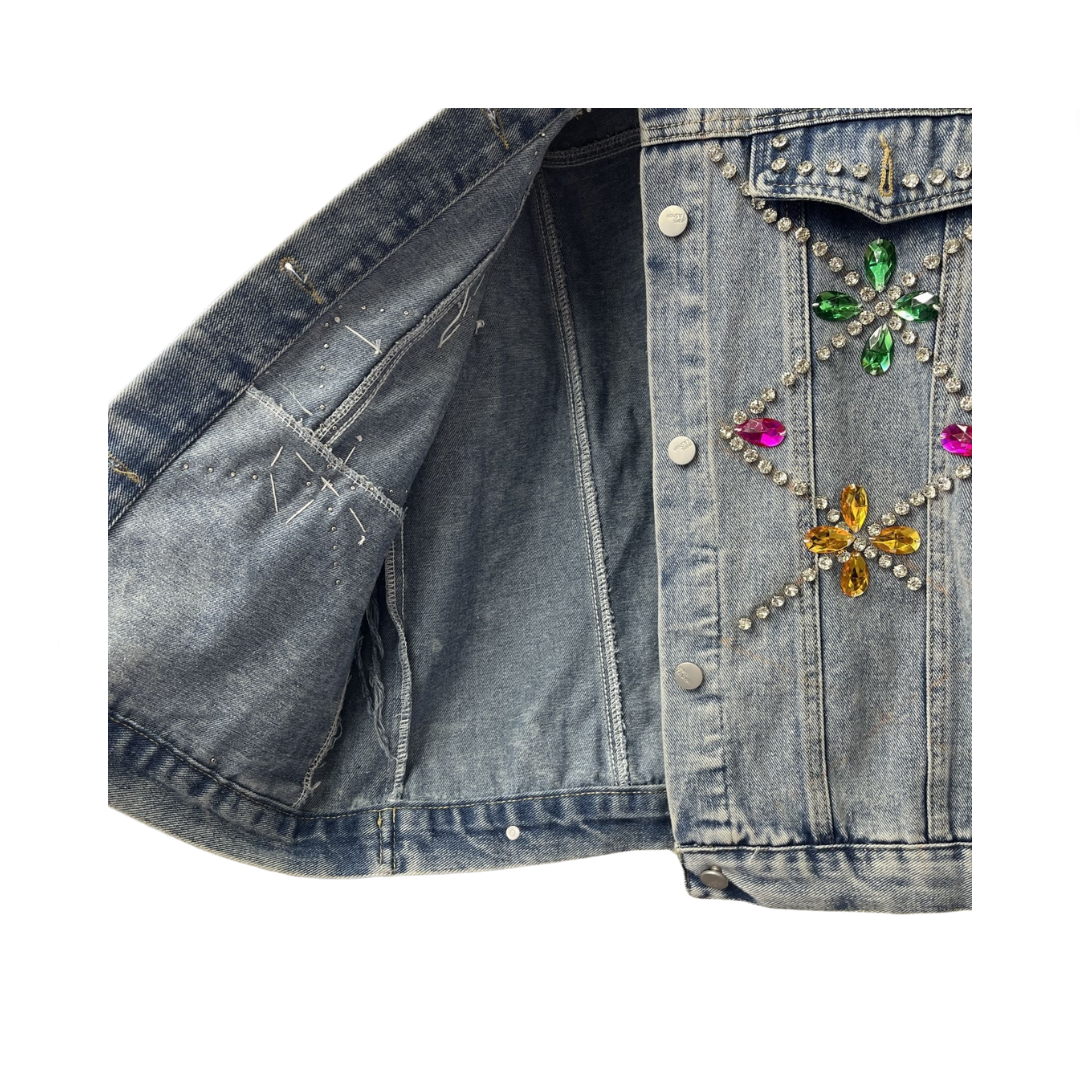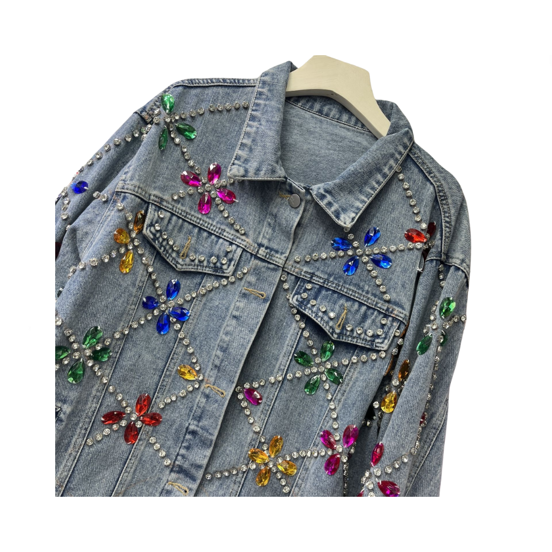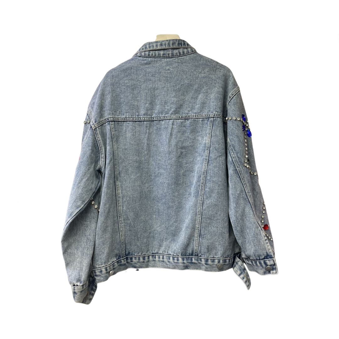 The perfect combination of edgy and chic. this jacket features exquisite nail bead inlays and sparkling diamond accents. Stand out from the crowd while staying comfortable in its loose fit.