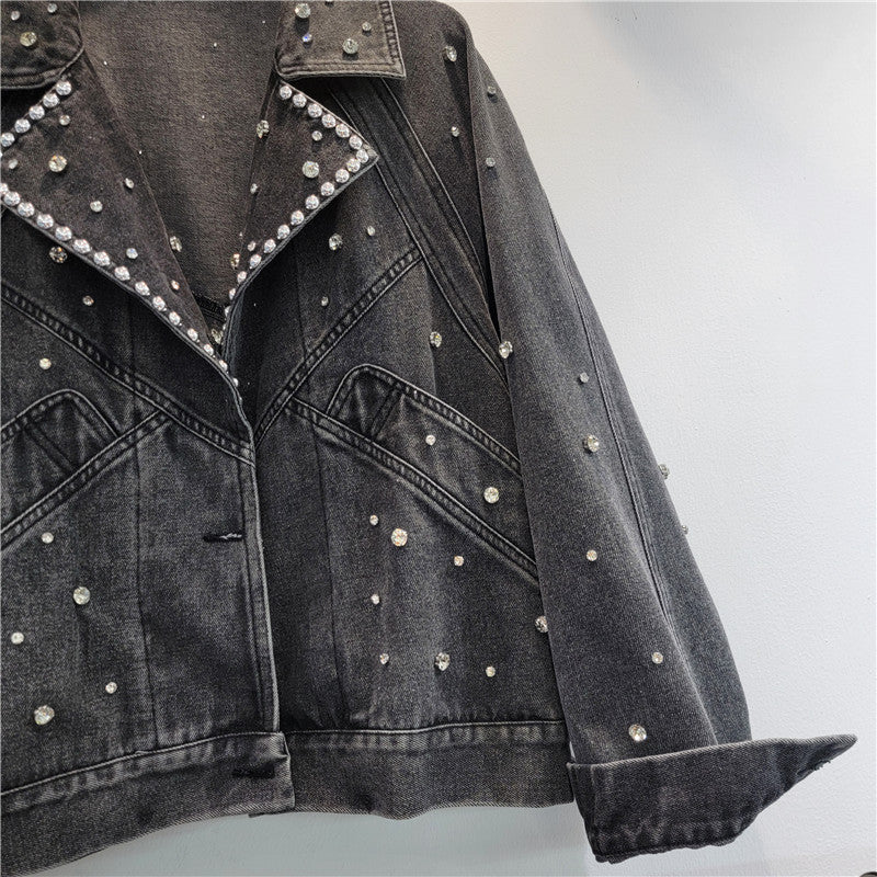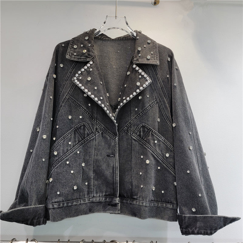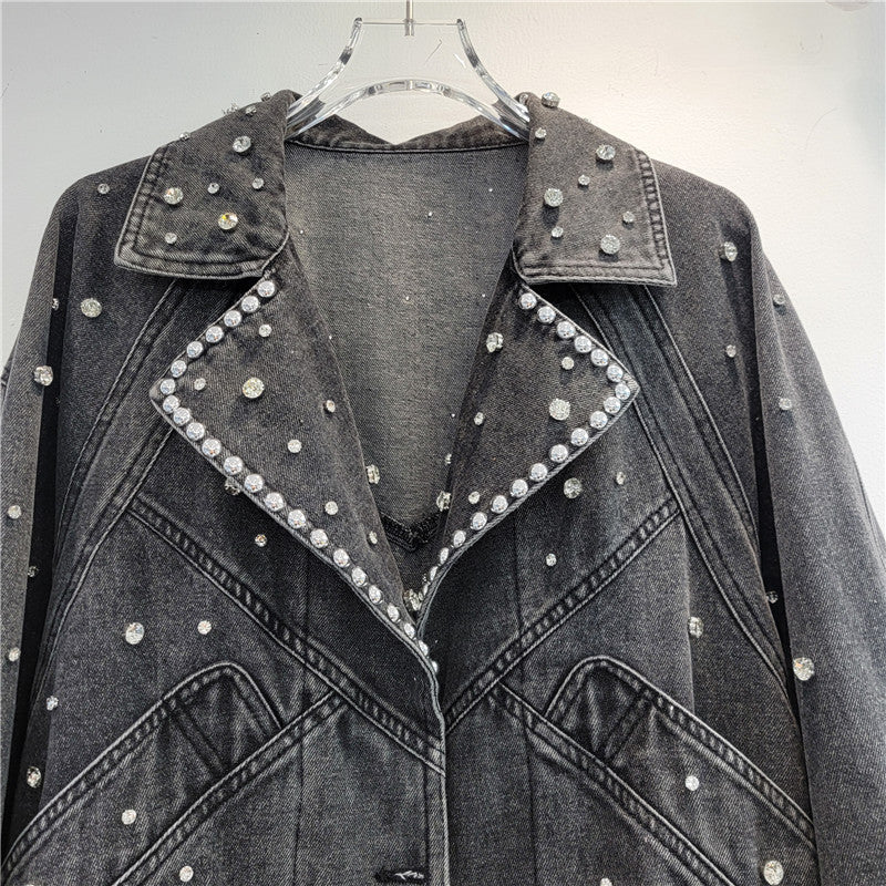 Ride in style with our Pre Order Nail Bead Studded Diamond Retro Motorcycle Denim Jacket. This jacket features intricate nail bead and diamond detailing. perfect for adding a touch of edginess to any outfit.