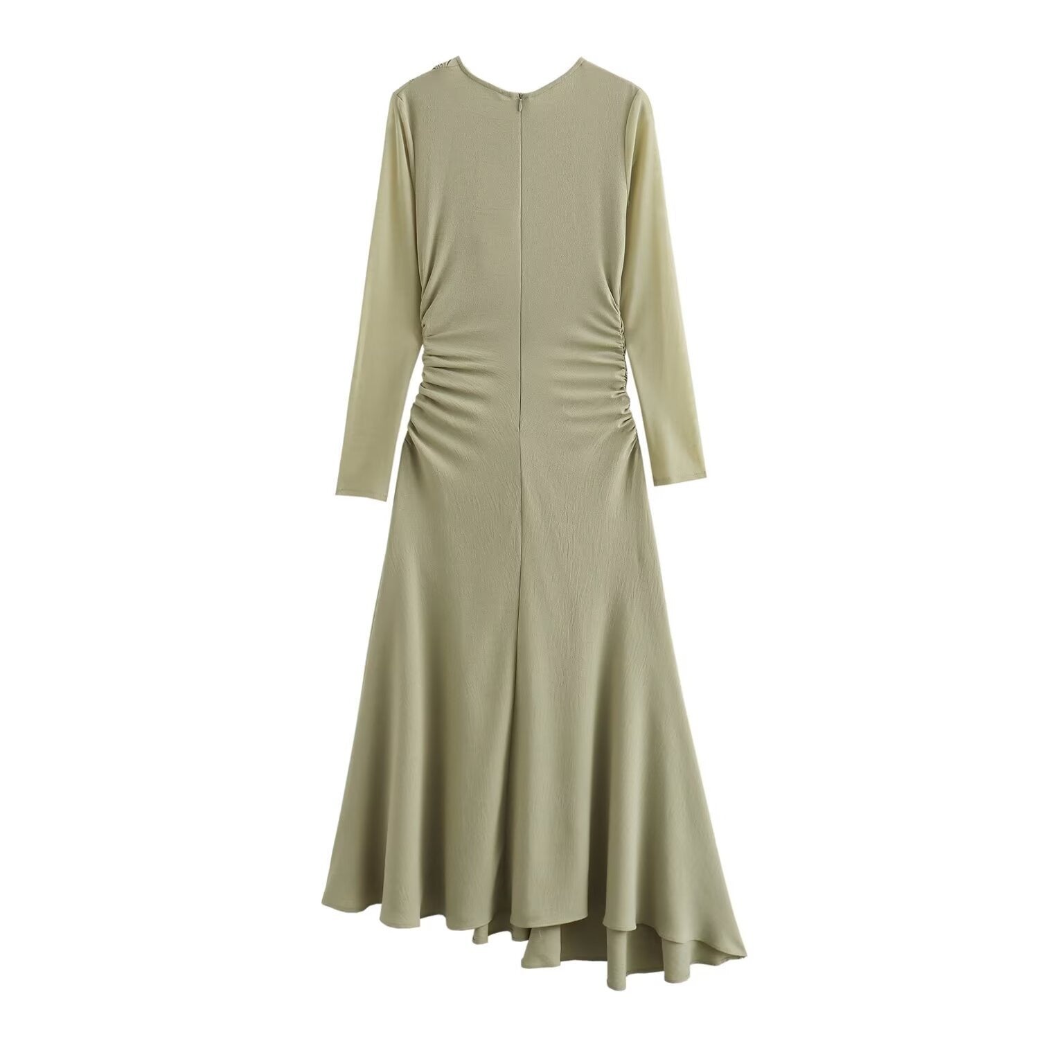 This Pleated Irregular Long Sleeved Midi Dress offers a sophisticated and stylish look with its pleated design and unique irregular hemline. The long sleeves provide both coverage and elegance. making it a versatile addition to any wardrobe.