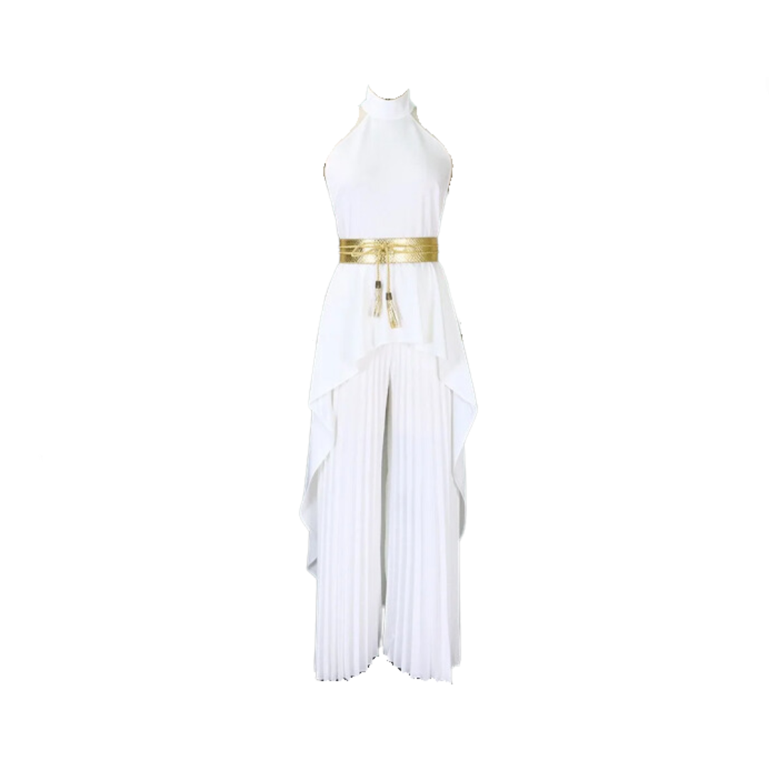 This stylish set includes a sleeveless. backless top with an irregular hem and wide leg pants. The unique design offers a bold and modern look. perfect for any fashion-forward individual.