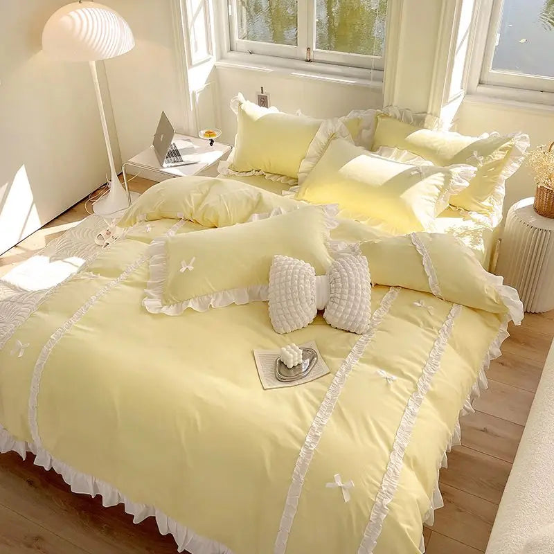 Princess Style Duvet Cover Set with Flat Sheet Pillowcases Korean Green Pink Girls Gift Spring Single Queen Size Bedding Kit