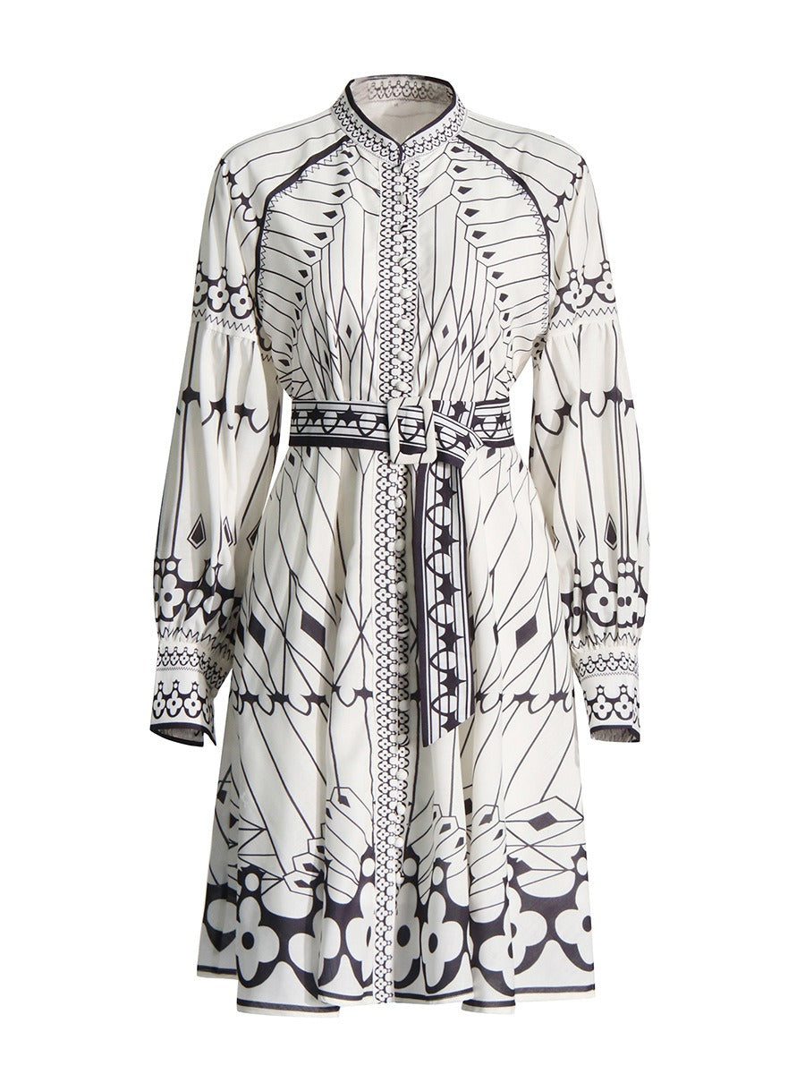 Designed for style and comfort. this dress features a unique printed design. a stand collar. and lantern sleeves. Perfect for any occasion. this dress will make you stand out while also keeping you comfortable.