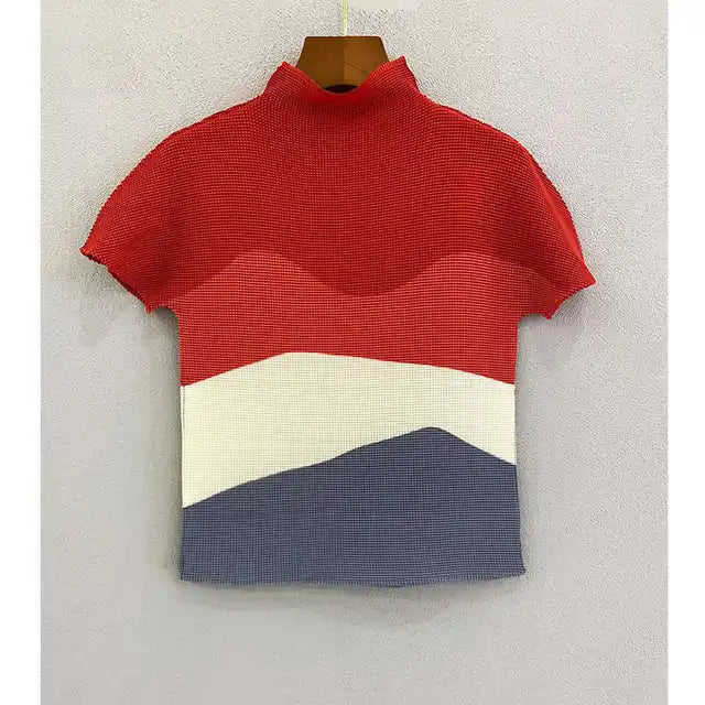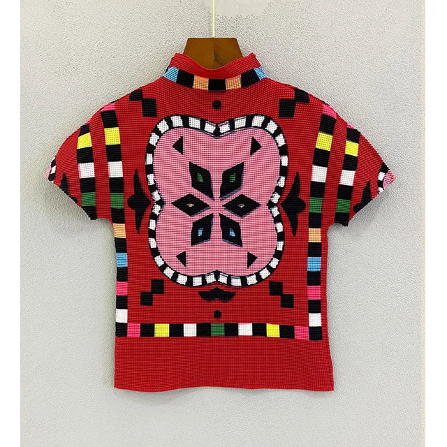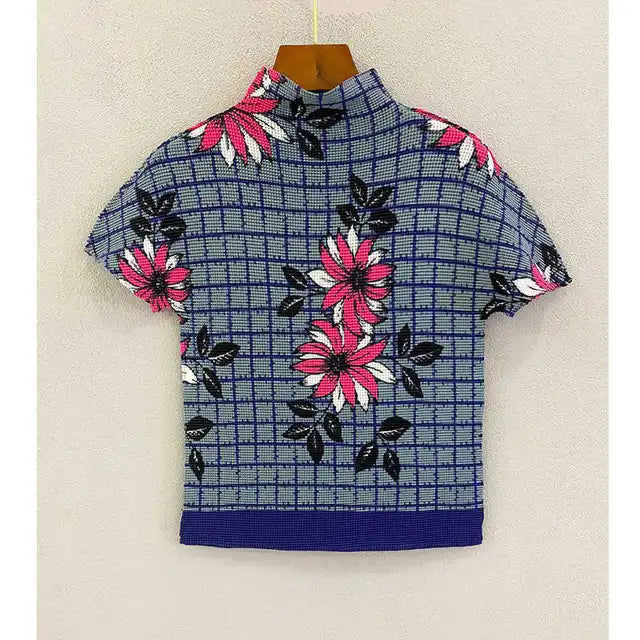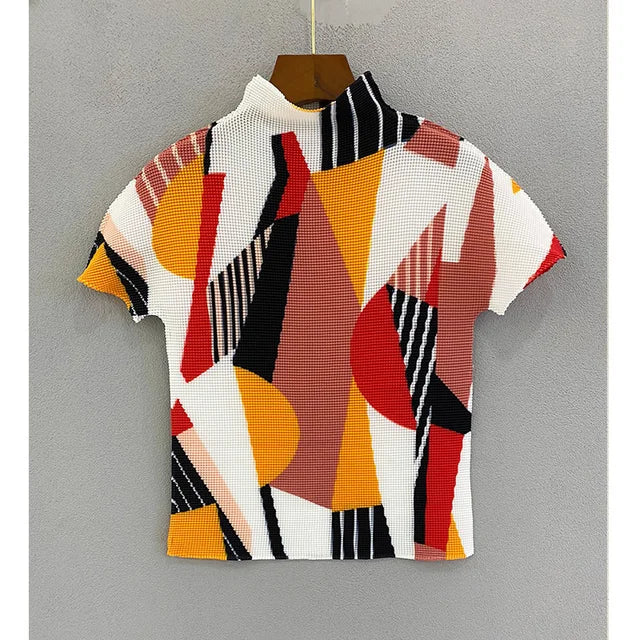 Made with a comfortable and stretchy fabric. this top features a chic printed pattern and pleated details for an elevated look. Perfect for a flattering and fashionable addition to any wardrobe.