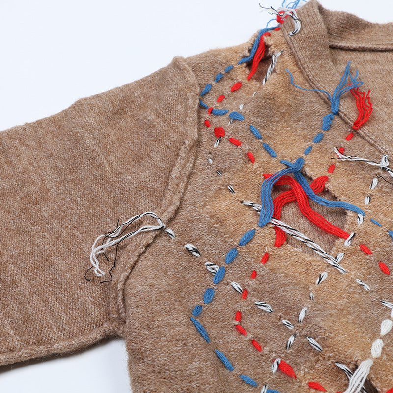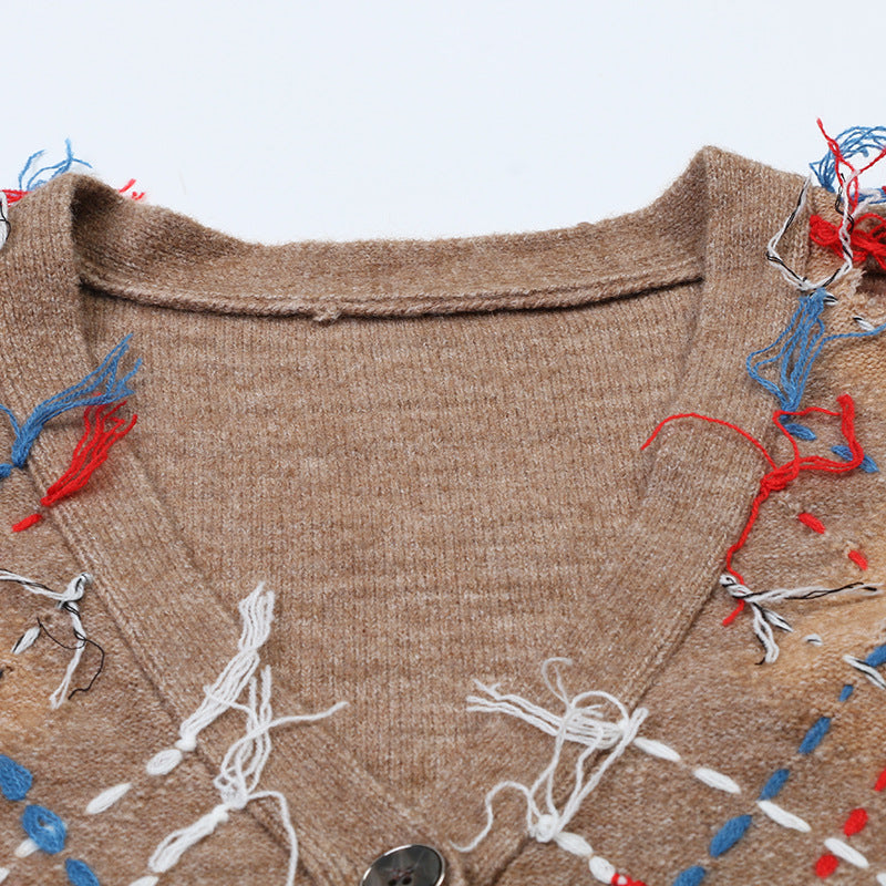 Made with a retro-inspired design. featuring broken holes and a v-neck cut with fringe details. Perfect for adding a touch of vintage to your wardrobe.