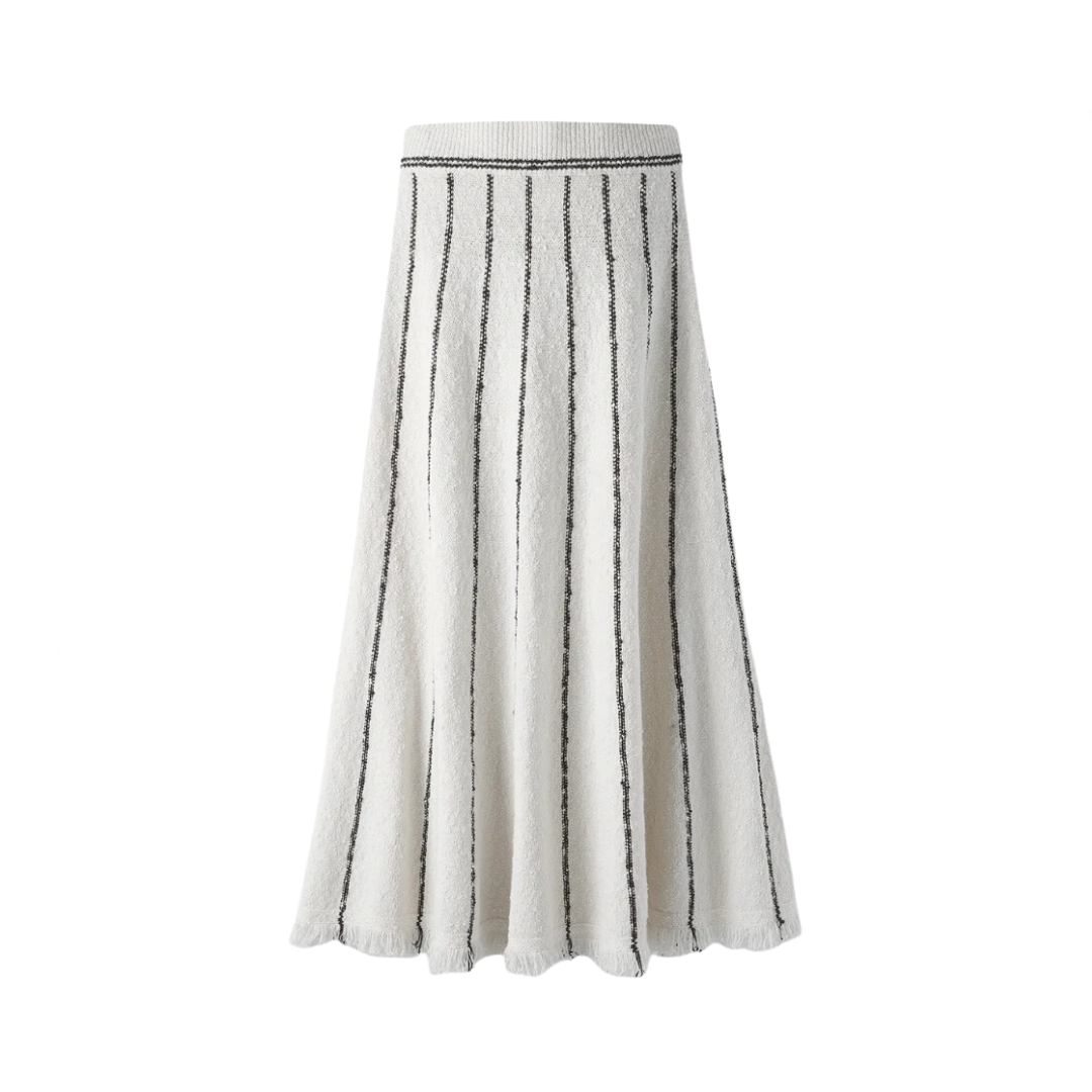 This stylish and versatile skirt combines retro-inspired stripes with a trendy fringe detail. Made from a cozy knit fabric. it offers both comfort and style.