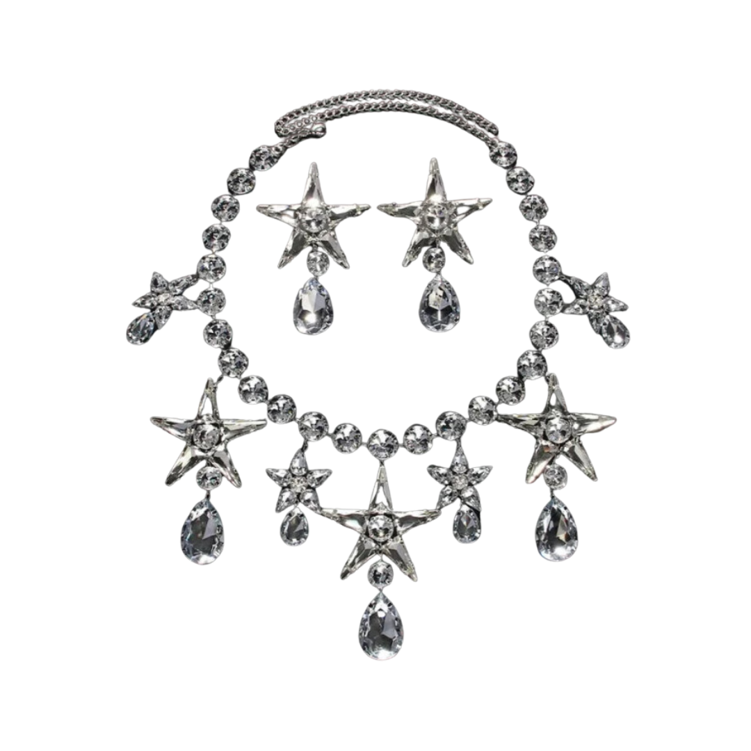 The set features stunning rhinestone-encrusted stars dangling from delicate water drop-shaped pendants. With this set. you'll be sure to shine like a star.