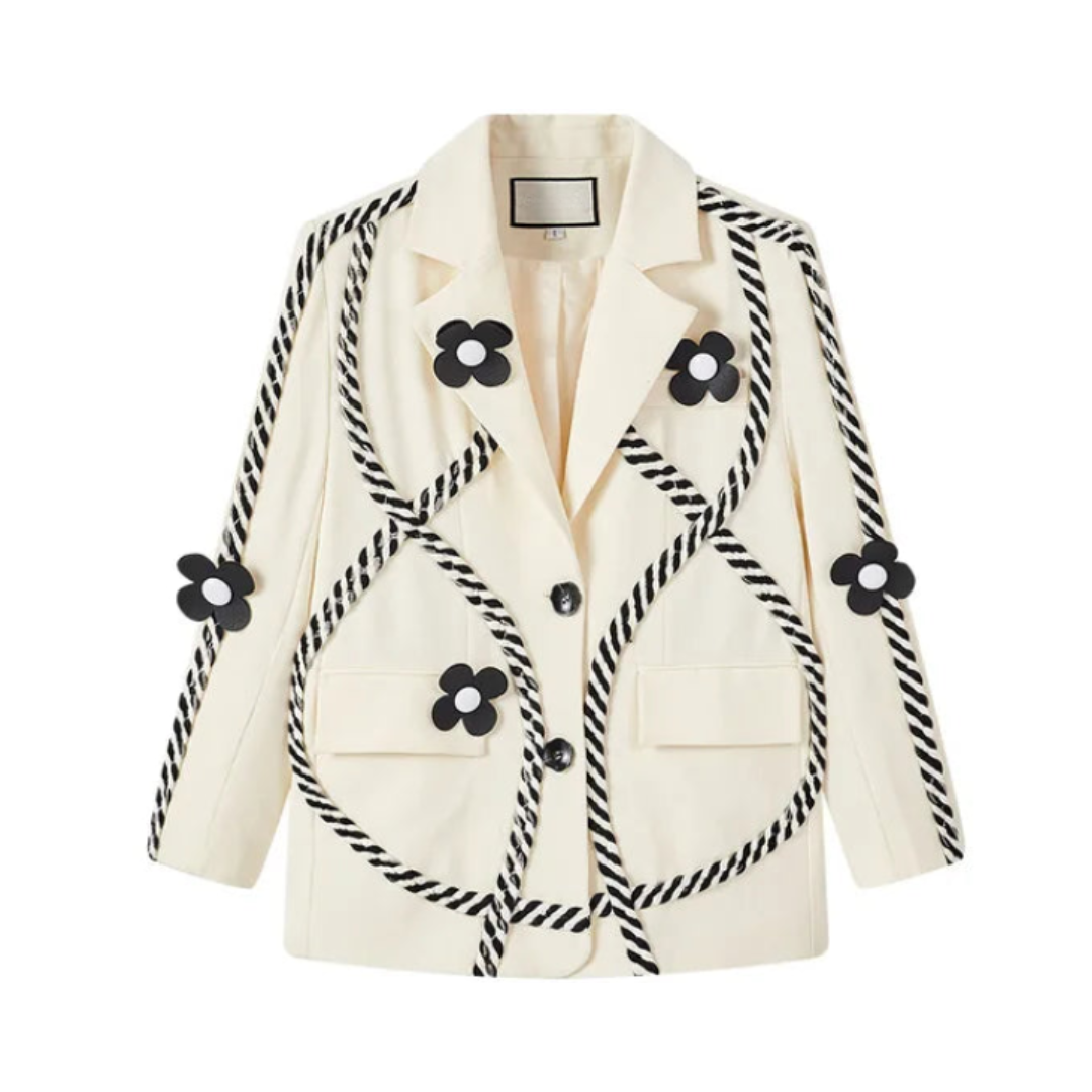 The intricate rope and floral detail add a touch of elegance and sophistication to this classic white blazer. Expertly crafted with precision. this blazer is both stylish and versatile. perfect for any occasion.
