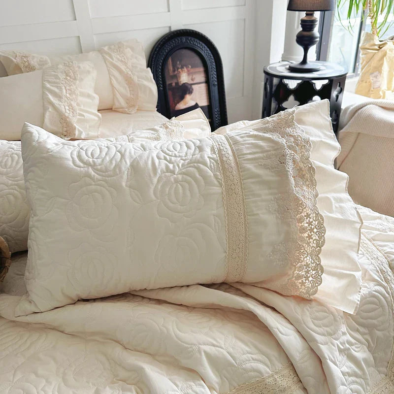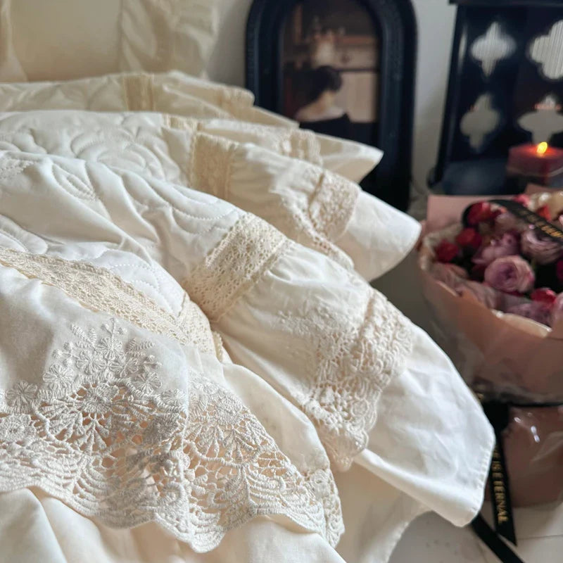 Rose Embossing Quilted Duvet Cover Set Vintage Lace Ruffles Pure Cotton Bedding Set Bed Sheet/Bed Skirt/Fitted Sheet Pillowcases
