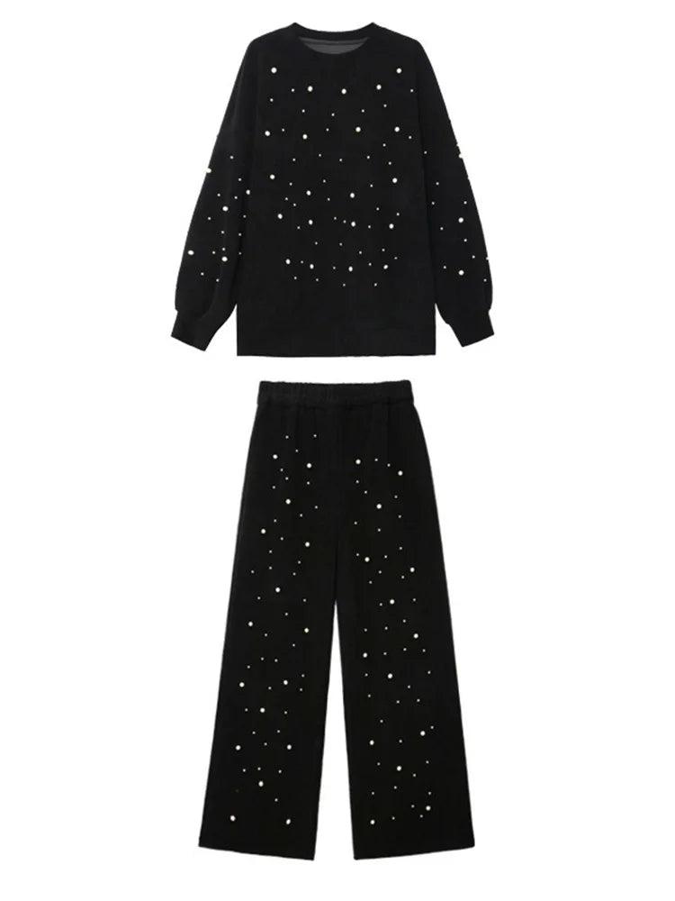 Designed with comfort in mind. this rounded neck sweater and wide leg pants set offers versatile and stylish options for any occasion. The loose fit and beaded details add a touch of elegance. while the wide leg design provides a flattering and comfortable fit.