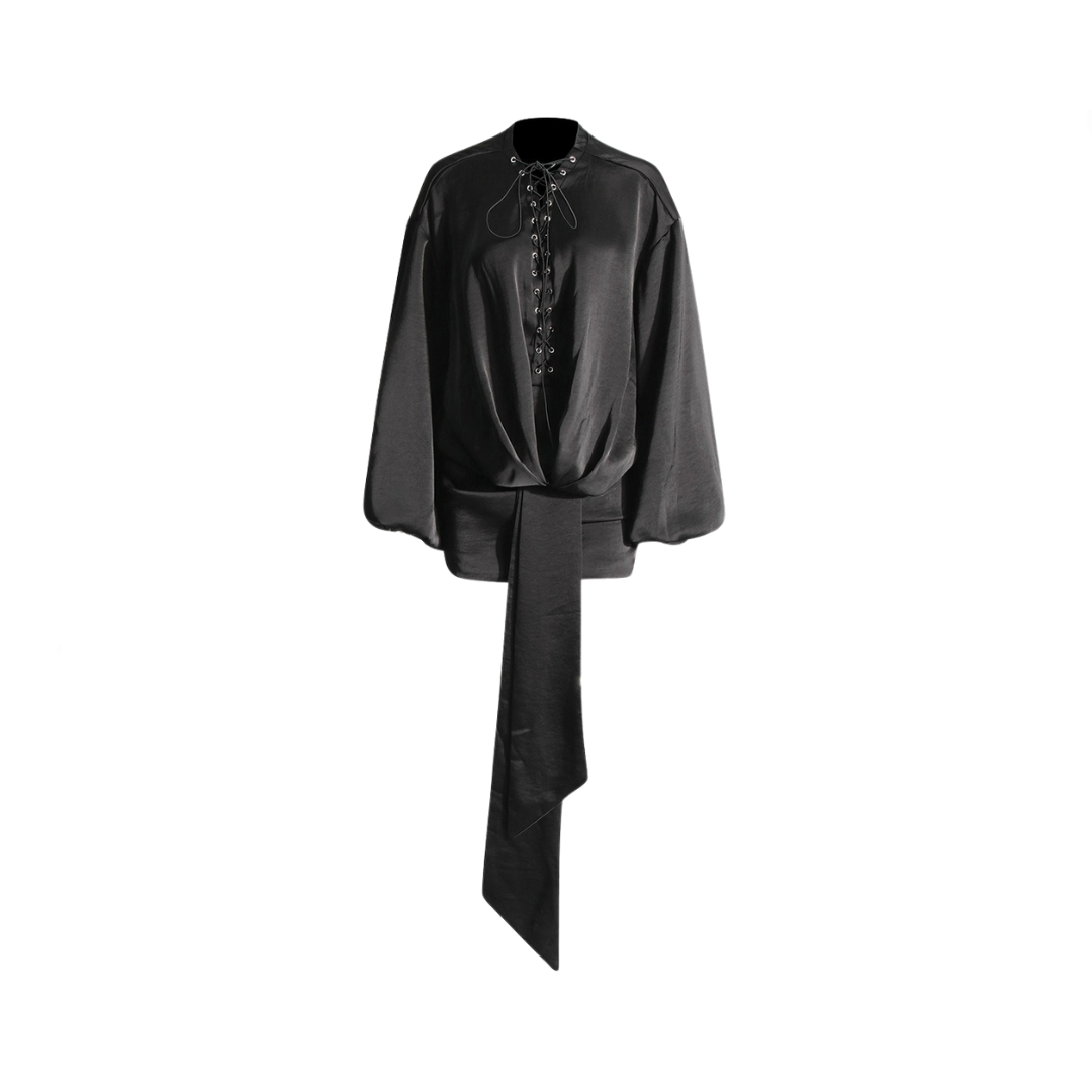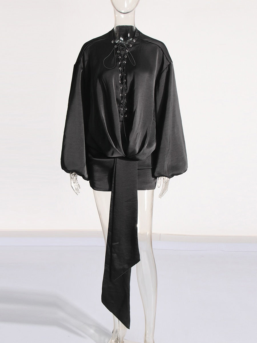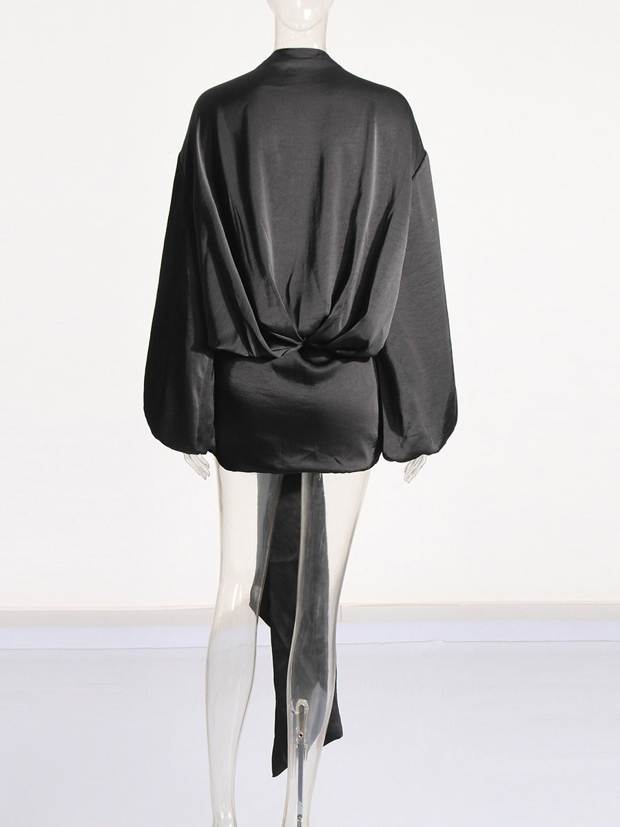 Made of satin and adorned with delicate lace. this dress will make you feel irresistibly alluring. The unique bubble sleeves add a playful touch to this otherwise sophisticated piece.