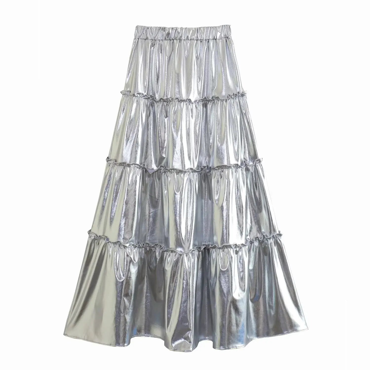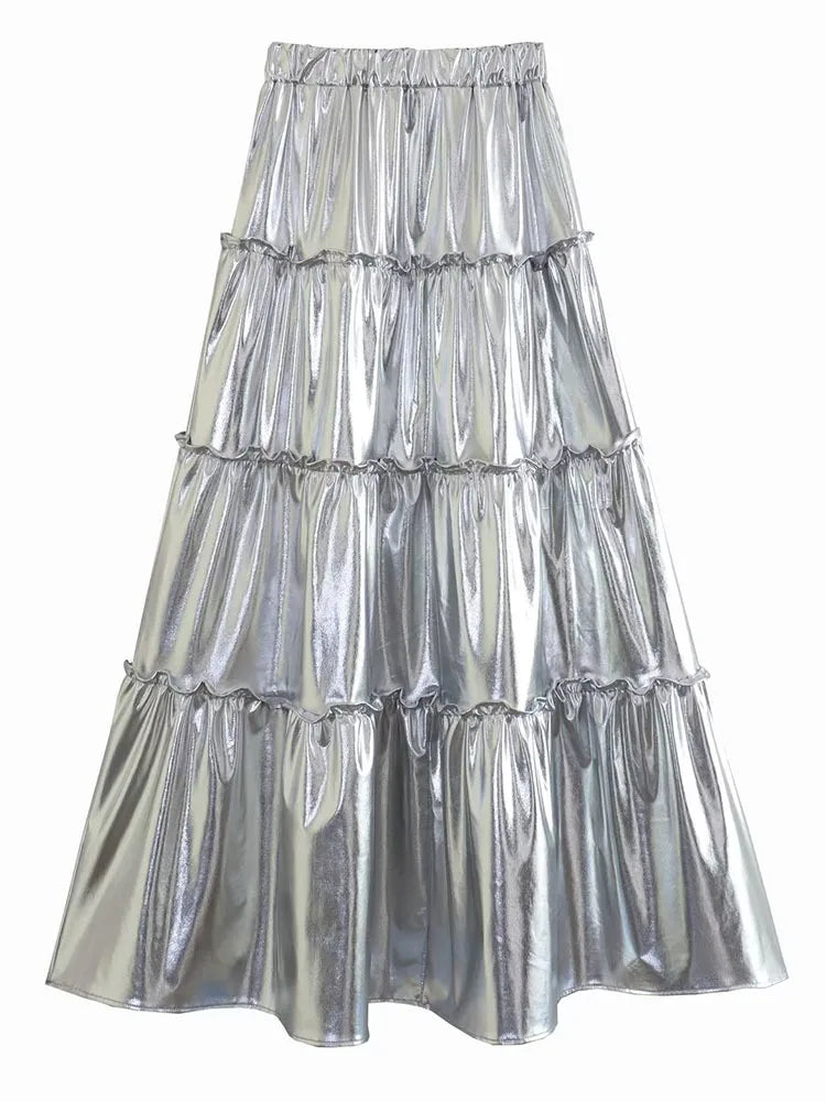 Crafted with a high waist. this silver layered A-line skirt offers a flattering fit that accentuates your figure. The elegant design adds a touch of sophistication to your wardrobe. while the A-line cut provides a comfortable and versatile piece that can be dressed up or down for any occasion.