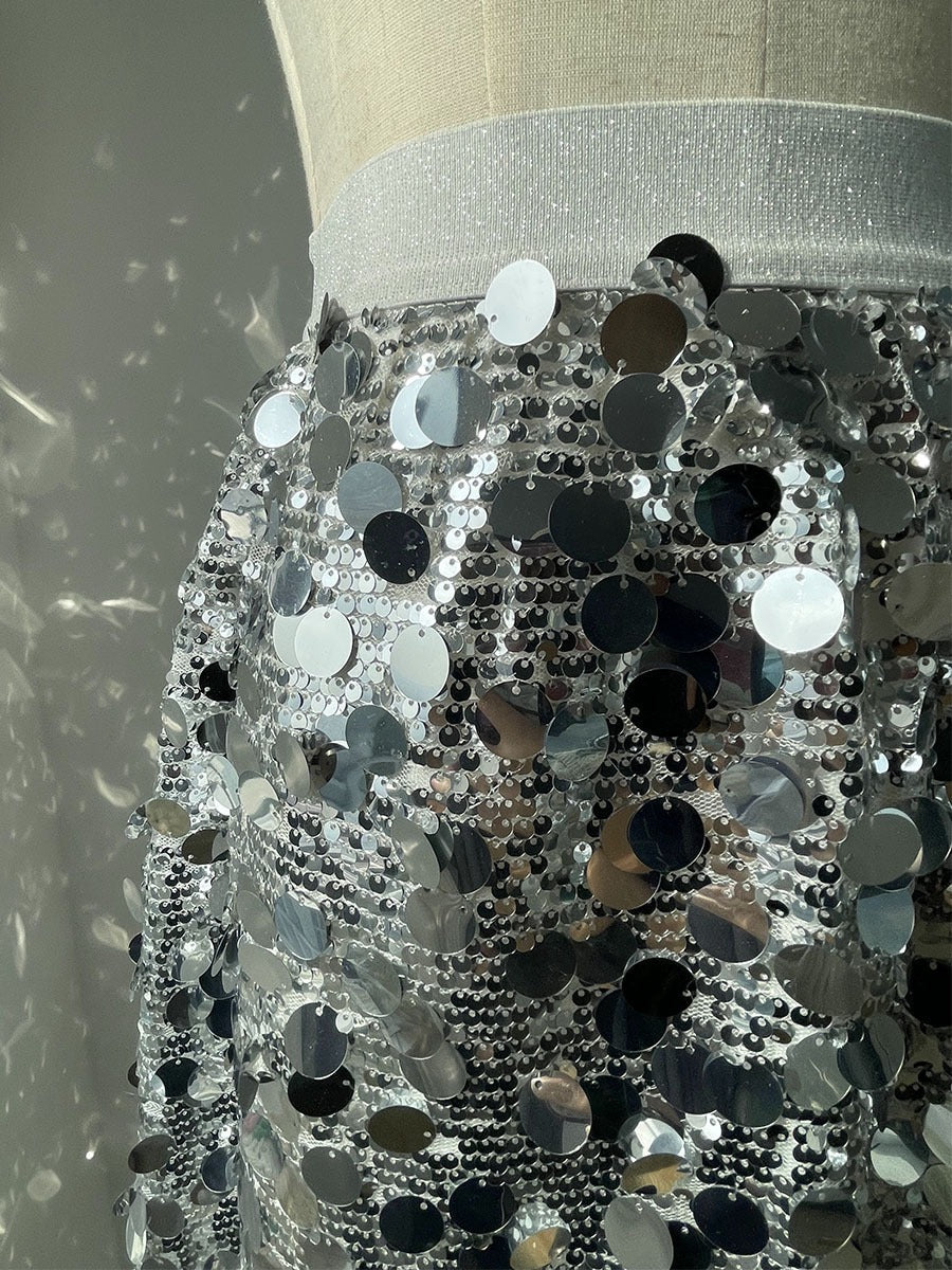 With a shimmering silver sequin design and comfortable elastic high waist. this skirt is perfect for adding a touch of glamour to any outfit. Elevate your style and make a statement at your next event with this must-have piece.