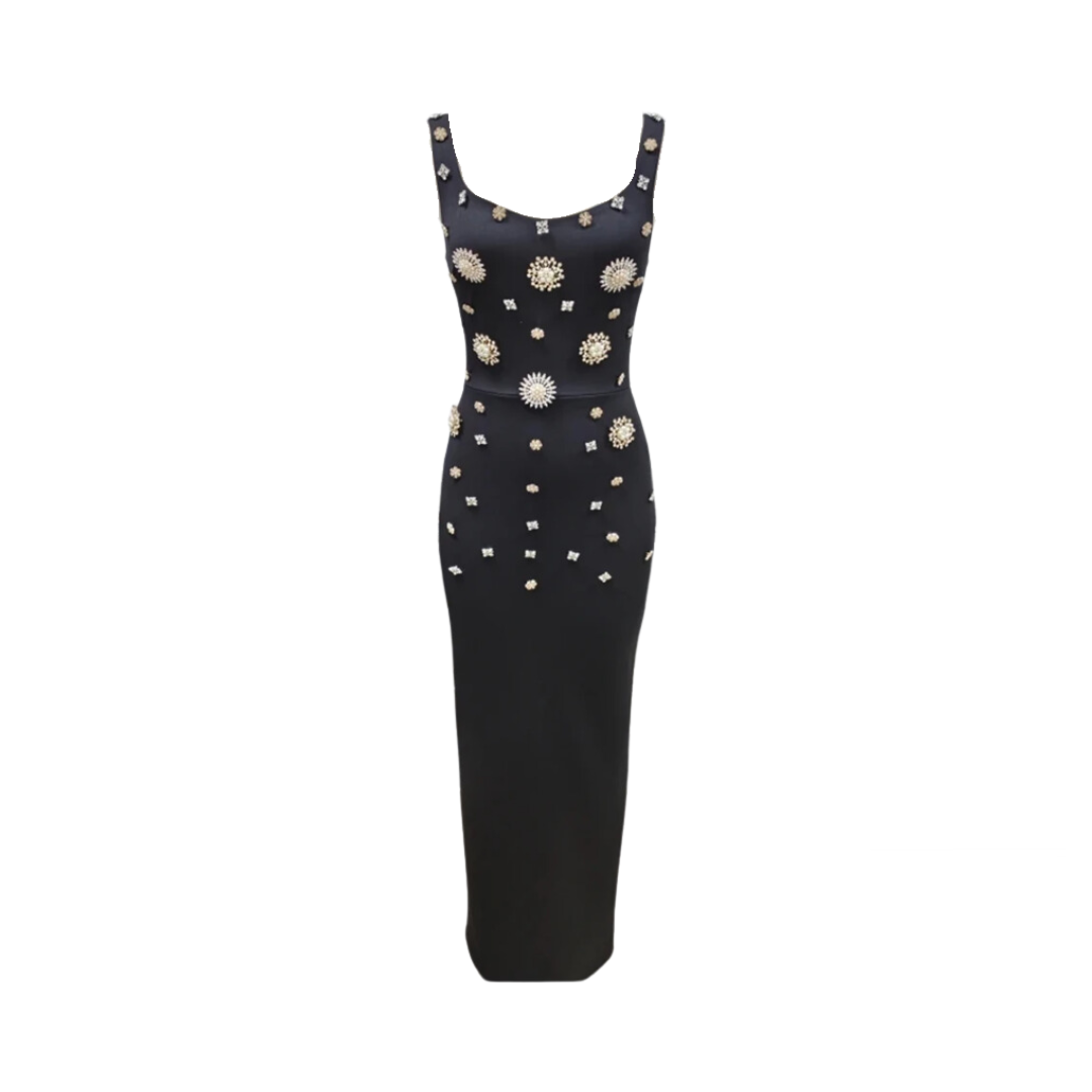 Crafted with a flattering slim fit and elegant sleeveless design. this dress is perfect for any occasion. The brooch embellishment adds a touch of sophistication. making you stand out with confidence.