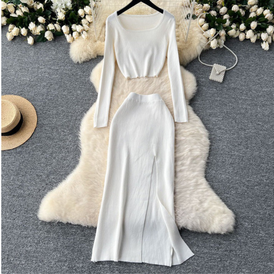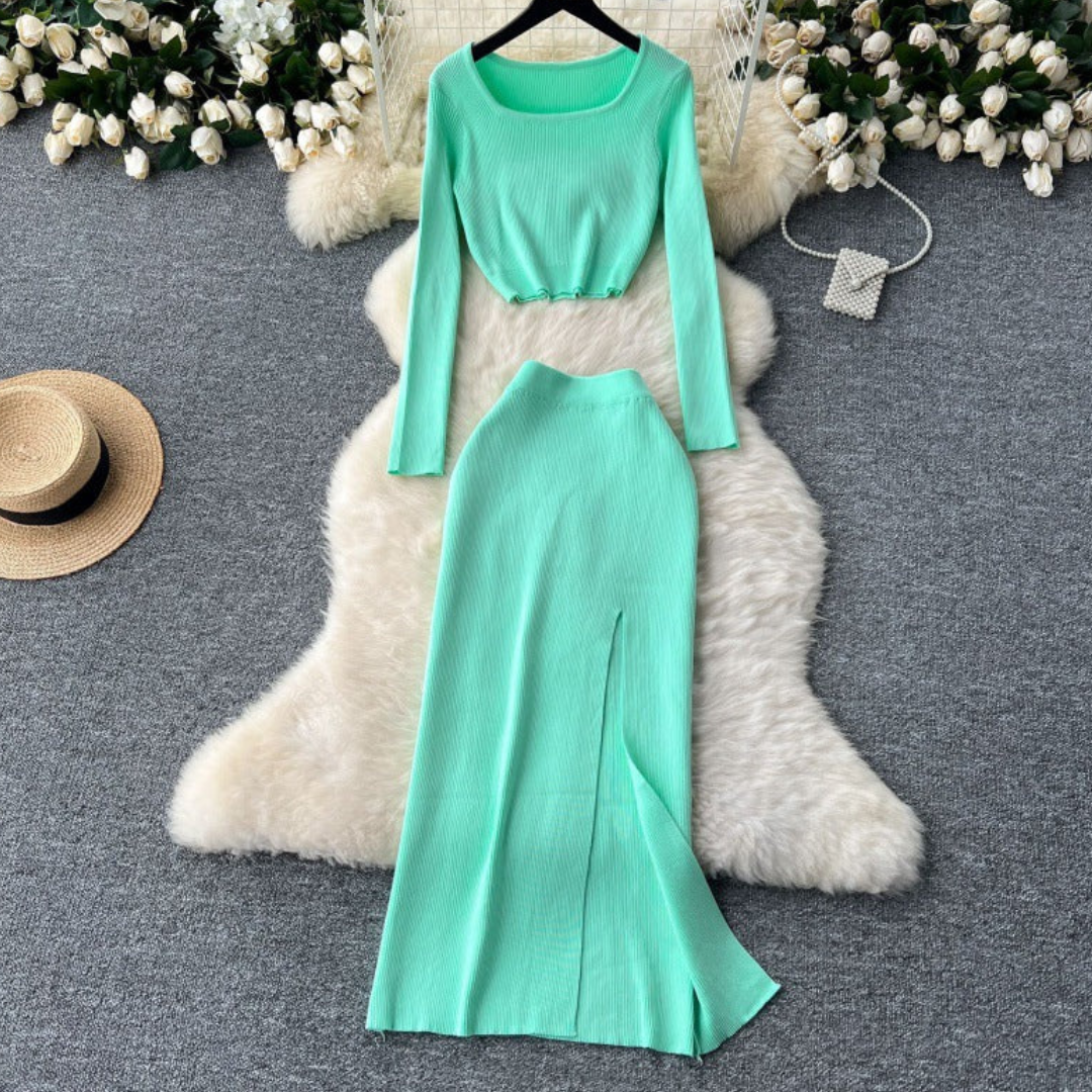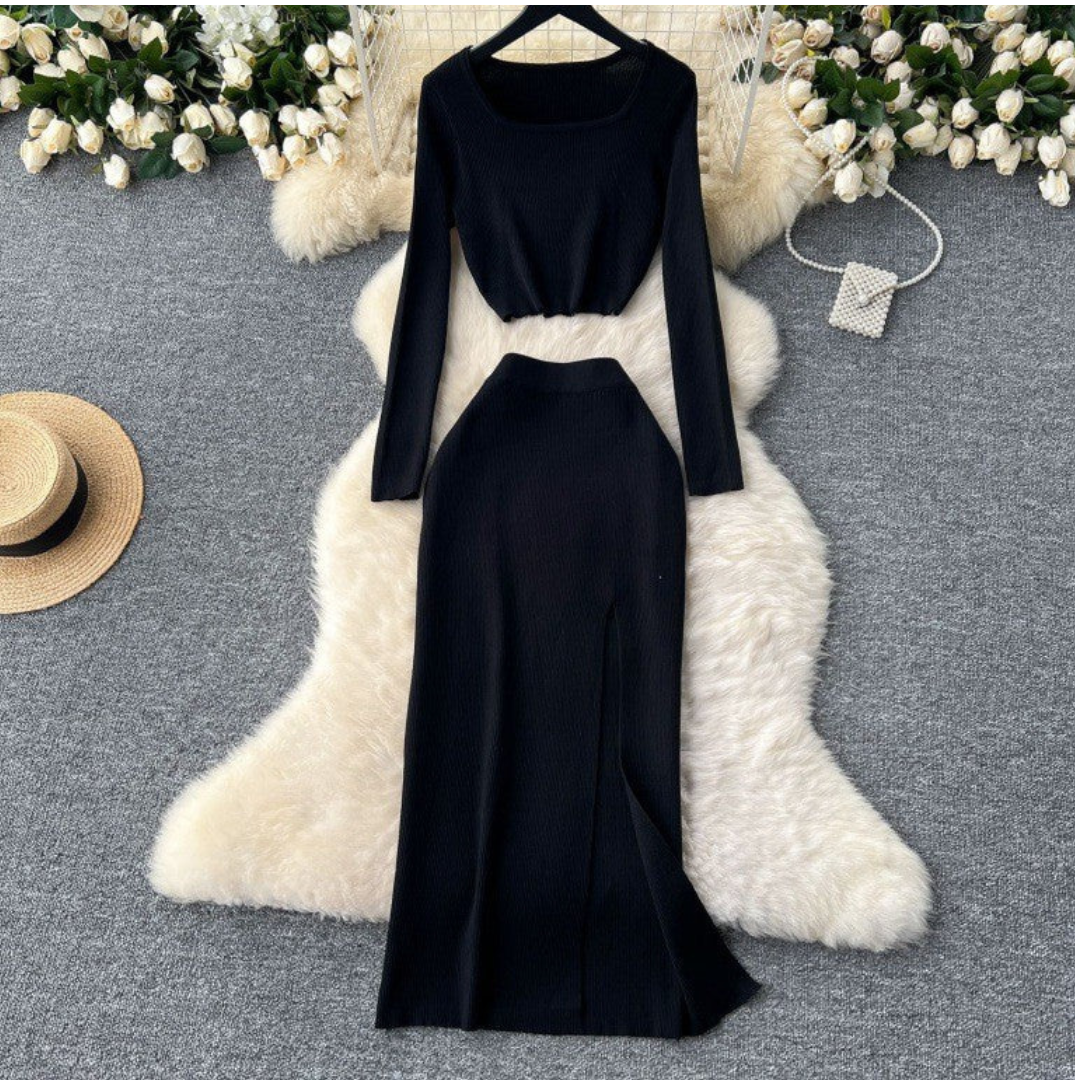 Expertly crafted with a slim fit design. this Square Neck Knitted Top provides a flattering silhouette for any body type. Paired with the Hip Hugging Slit Skirt. this versatile duo offers both style and comfort.