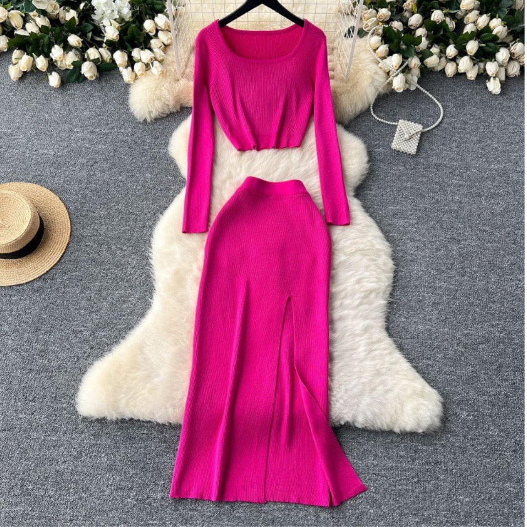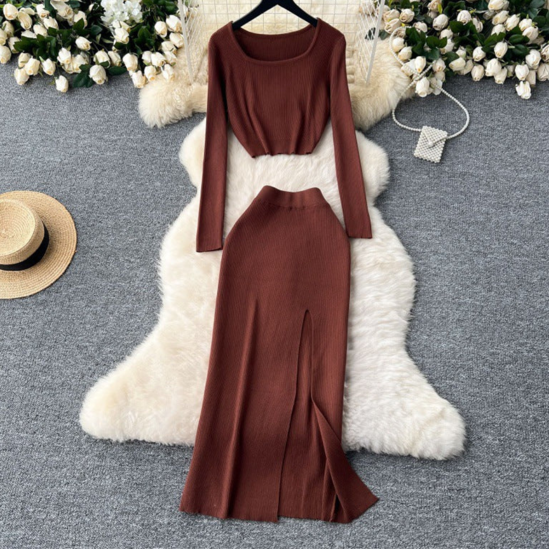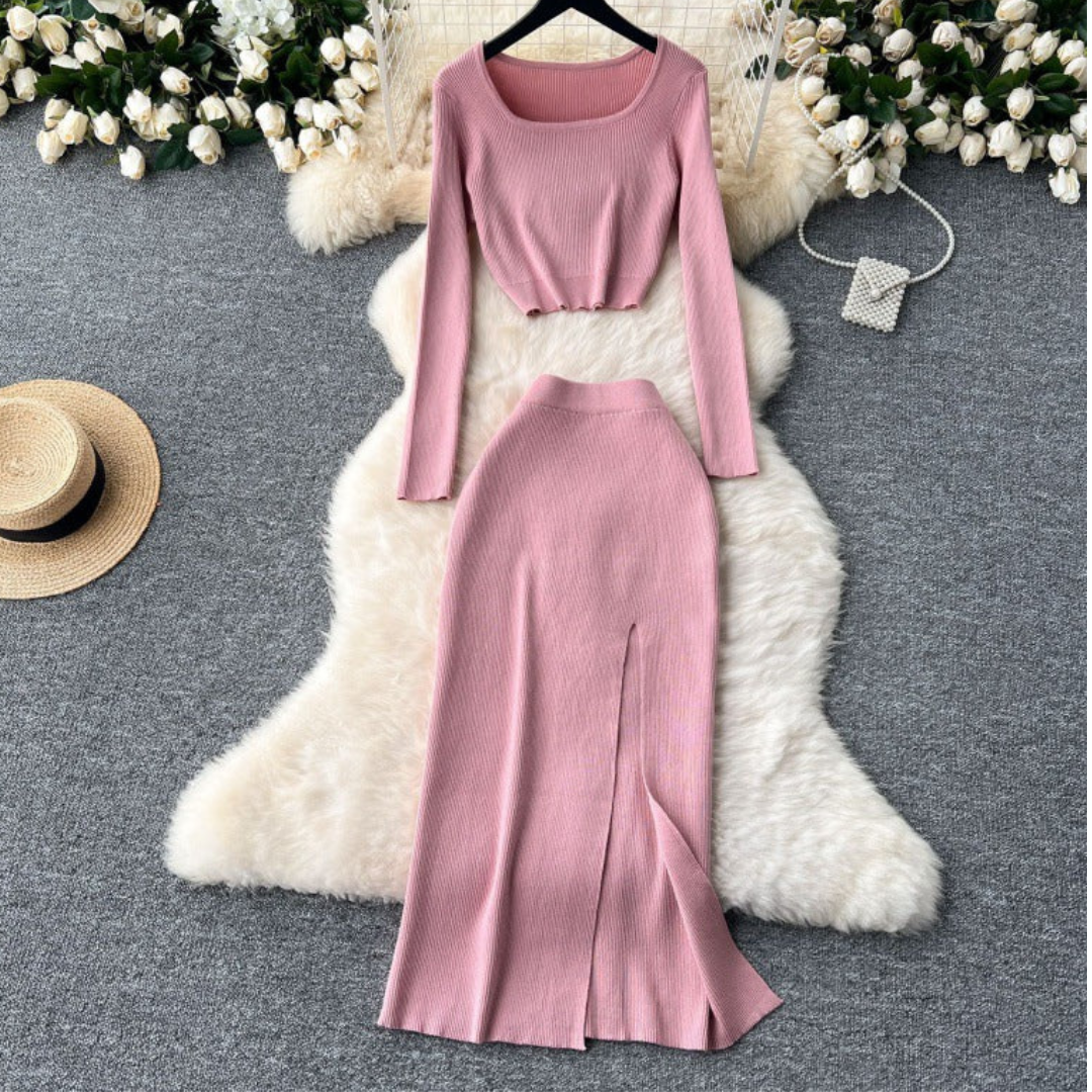 Expertly crafted with a slim fit design. this Square Neck Knitted Top provides a flattering silhouette for any body type. Paired with the Hip Hugging Slit Skirt. this versatile duo offers both style and comfort.