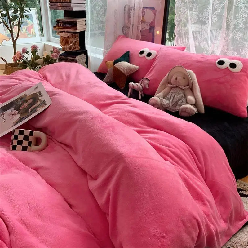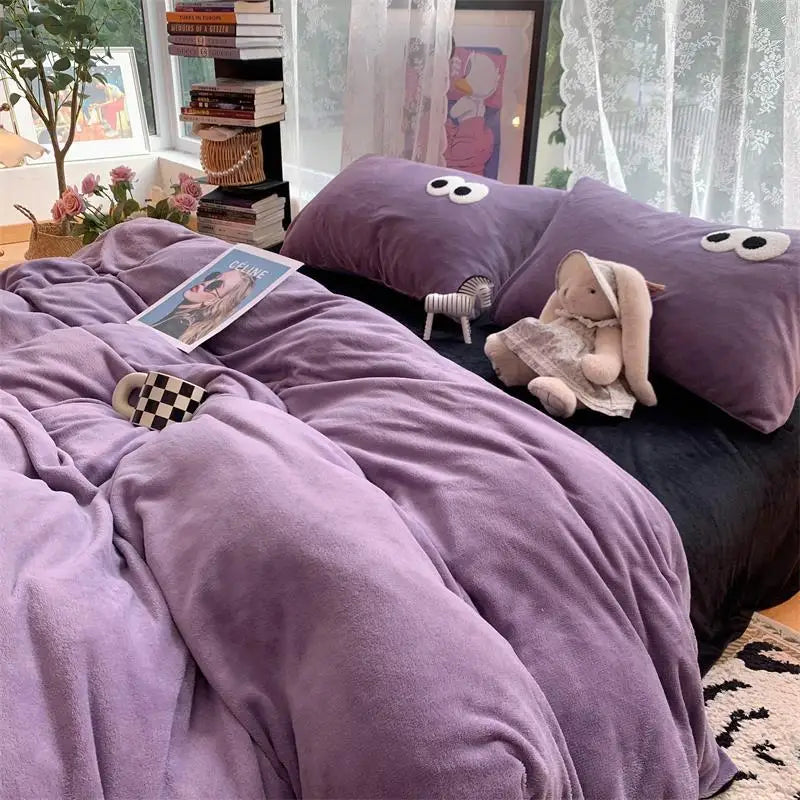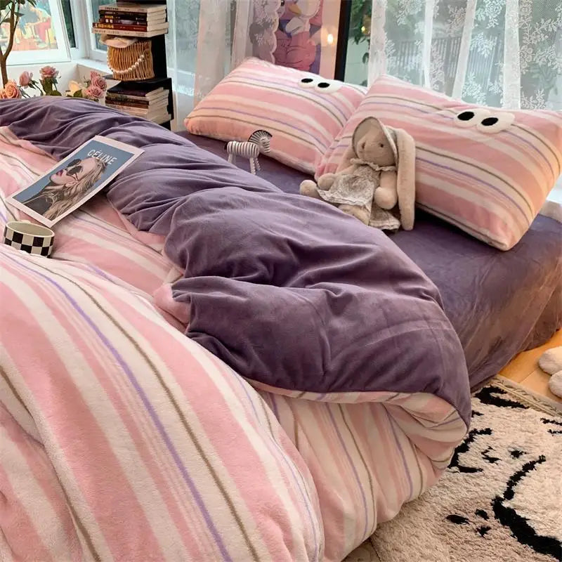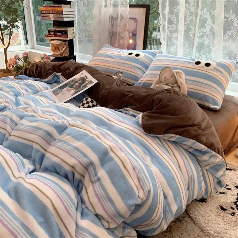 Small Fresh Ins Big Blue Stripes Winter Warm Four-piece Bedding Set Quilt Cover Milk Velvet Bed Sheet Farai Velvet Three-piece