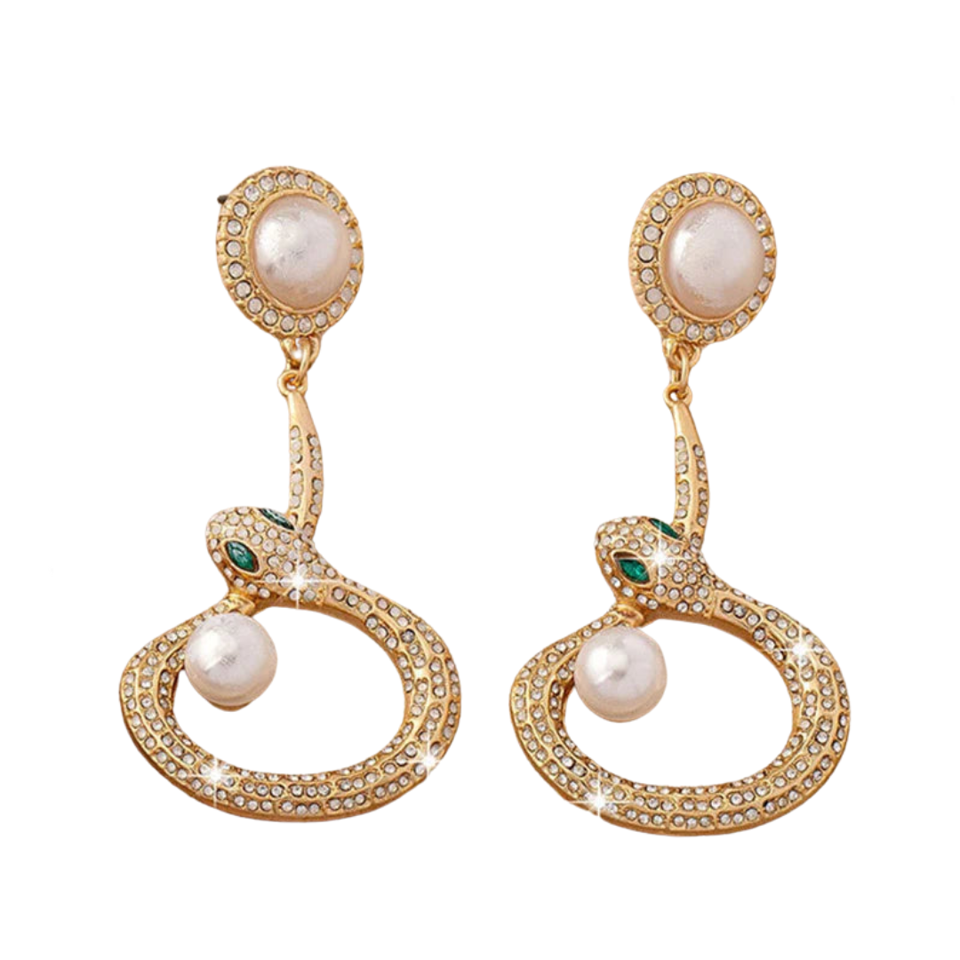 Expertly crafted with a unique and elegant design. our Snake Shaped Pearl Diamond Inlaid Earrings are the perfect addition to any jewelry collection. The exquisite diamond inlays add a touch of luxury. while the beautiful pearl shines with natural beauty.