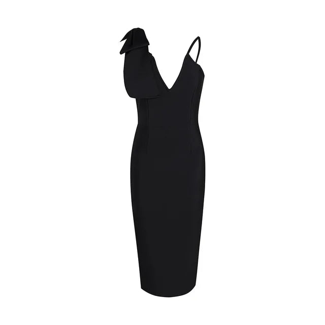 Expertly crafted. this bandage dress features a solid V-neck design with a charming bow detail. The backless and sleeveless cut adds a touch of allure. making it perfect for a night out or any special occasion.
