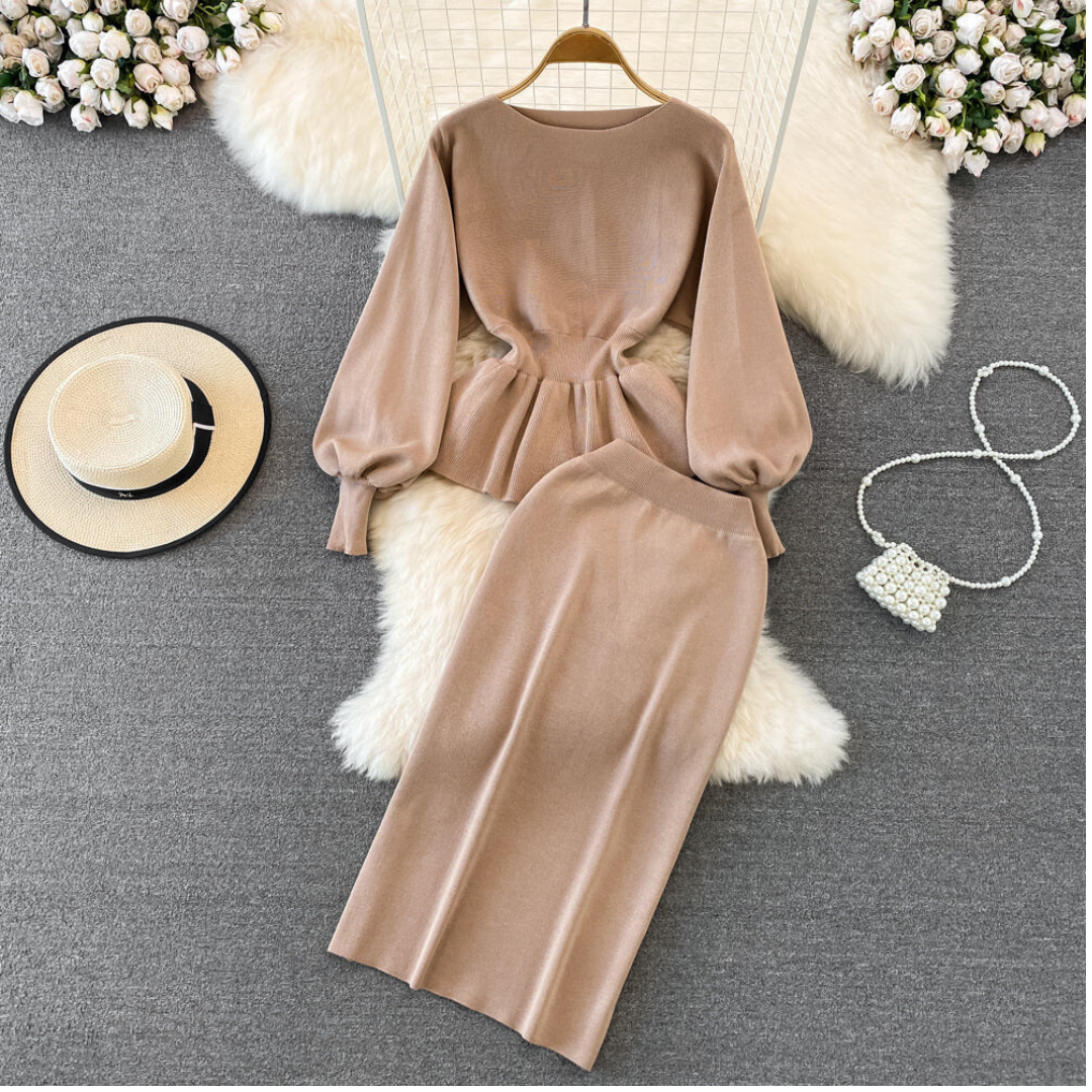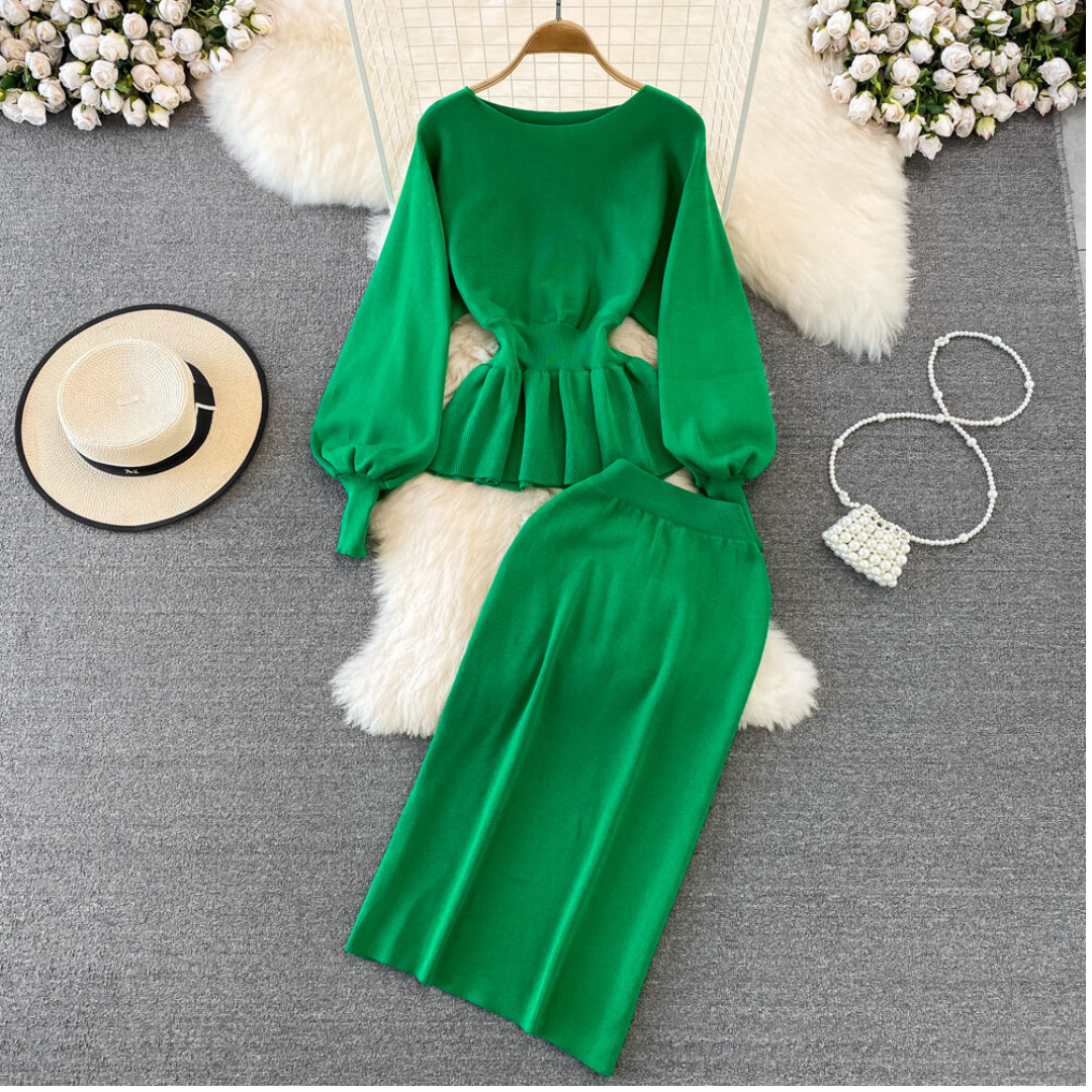 This set includes a solid knit top with a cinched waist. paired with a hip-hugging skirt. The top complements your figure with a cinched waist. while the skirt accentuates your curves.
