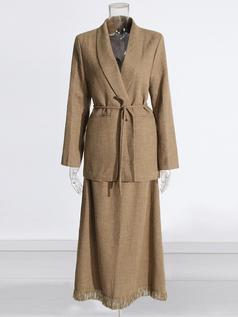 The jacket provides a flattering fit at the waist for a polished appearance. while the tassel skirt adds a touch of sophistication. Perfect for any formal occasion. this set is sure to impress.