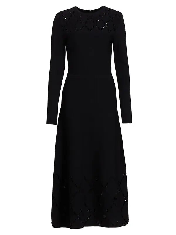 Crafted from high-quality fabric. this Solid Diamond Hollow Knitted Midi Dress boasts a timeless design that combines comfort and style. Perfect for any occasion. its unique features. such as the intricate diamond hollow knit pattern. make it a must-have for fashion-forward individuals.