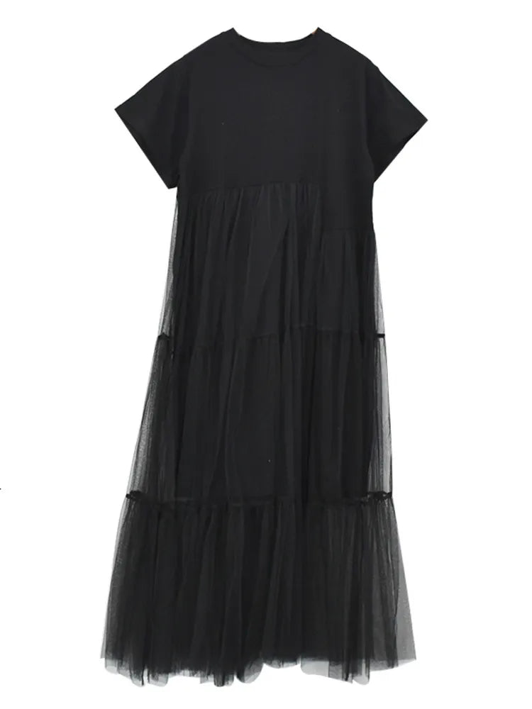 Crafted with a sleek silhouette and intricate mesh details. the Solid Irregular Mesh Spliced A-Line Dress elevates any occasion. Its A-line design accentuates curves while providing a comfortable fit.