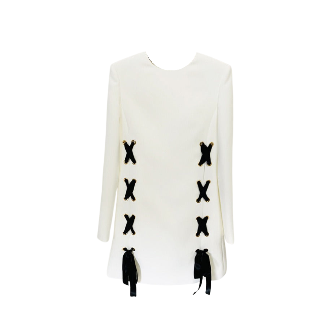 This dress features a solid color design. accented with a stylish ribbon tied around the waist. The round neck and long sleeves create a casual yet elegant look.