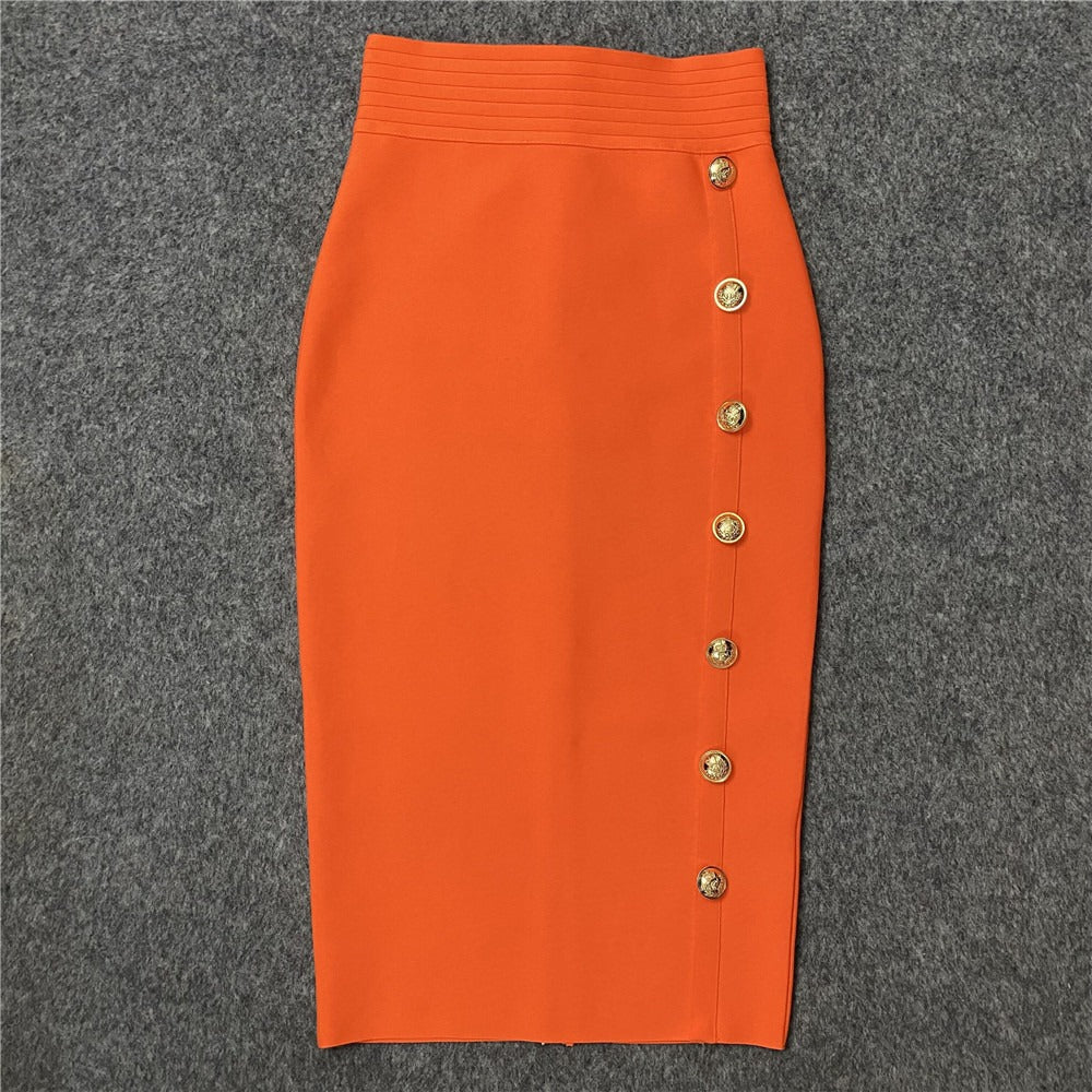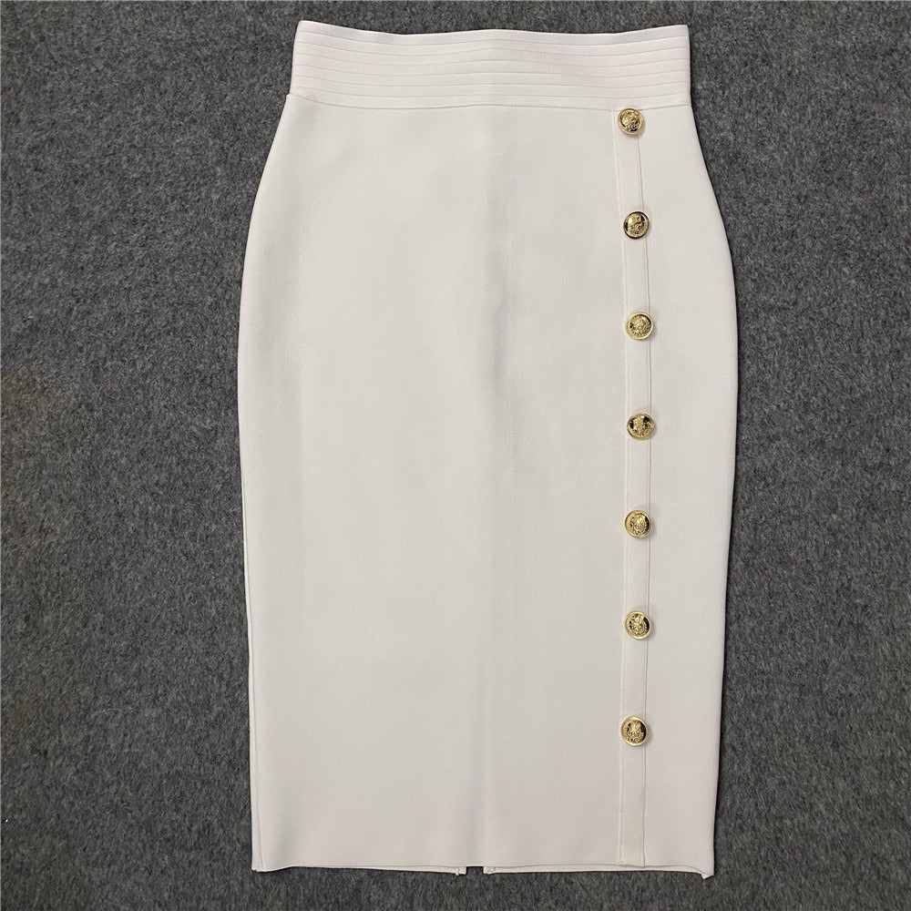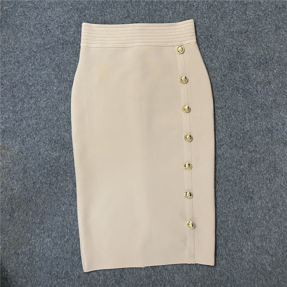 Featuring a single row of buttons. this skirt offers a secure and comfortable fit. The solid design adds a touch of sophistication while the bandage material provides a flattering shape.