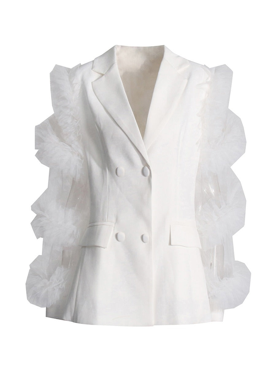 Constructed with quality mesh and exquisite ruffle detailing. this jacket offers a flattering and feminine touch to any outfit. The solid splicing design adds a modern and chic element. making it a versatile choice for both professional and social occasions.