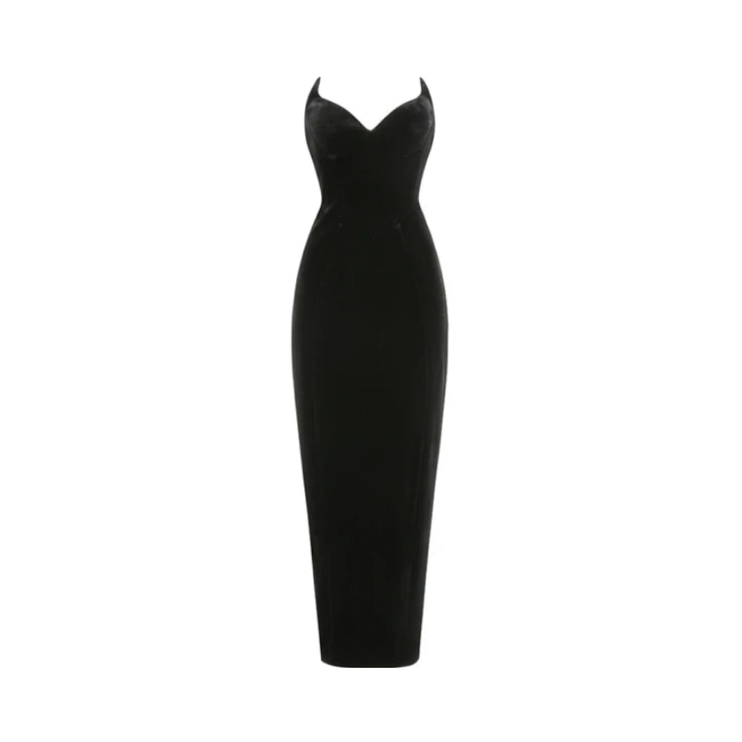 With a V-neck and backless design. it offers a slim fit and emphasizes the buttocks. The mid length cut adds a touch of formality to this versatile dress.
