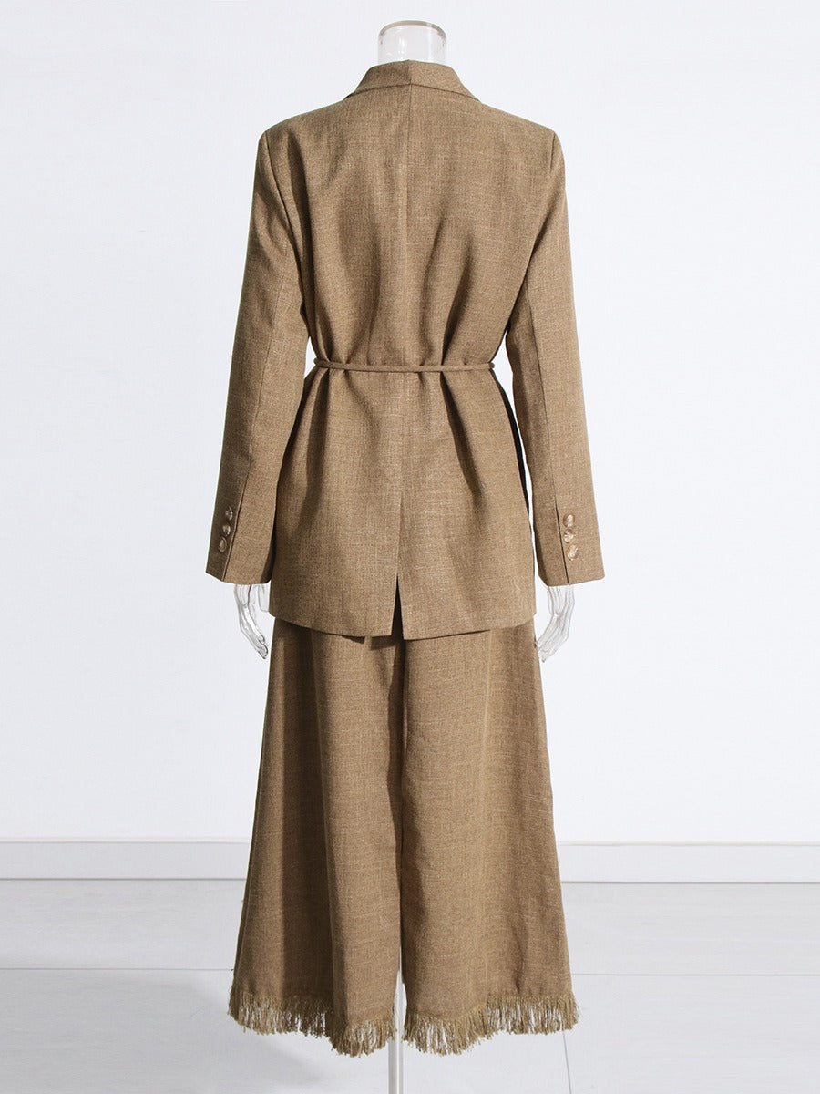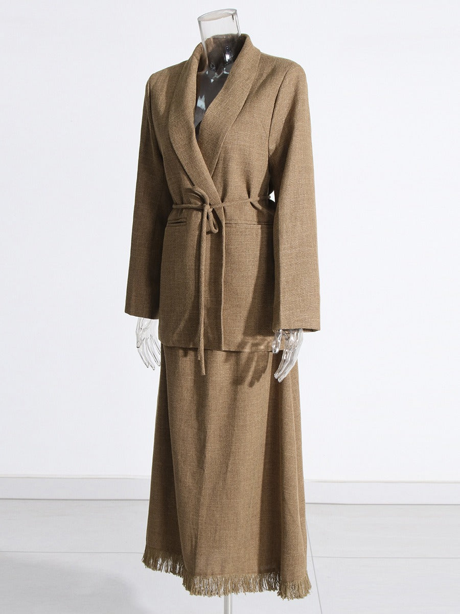 This Solid Waist Suit Jacket and Tassel Skirt is the perfect outfit for a professional and stylish look. The suit jacket provides a structured and tailored fit. while the tassel skirt adds a touch of elegance.