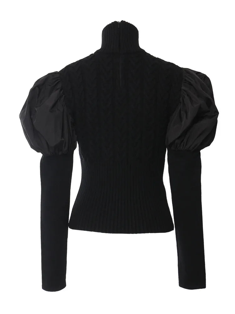 Expertly crafted. the Spliced Bubble Sleeve Turtleneck Slim Knitted Top effortlessly combines style and comfort. With unique bubble sleeves and a figure-flattering slim fit. this top is perfect for any occasion.