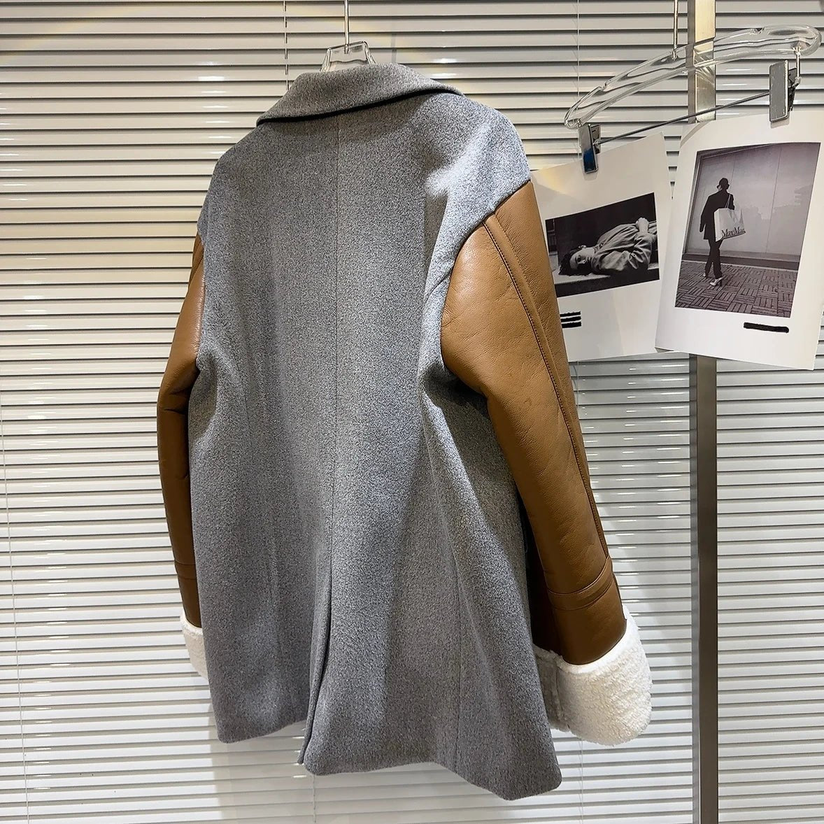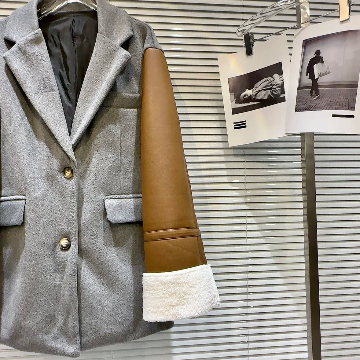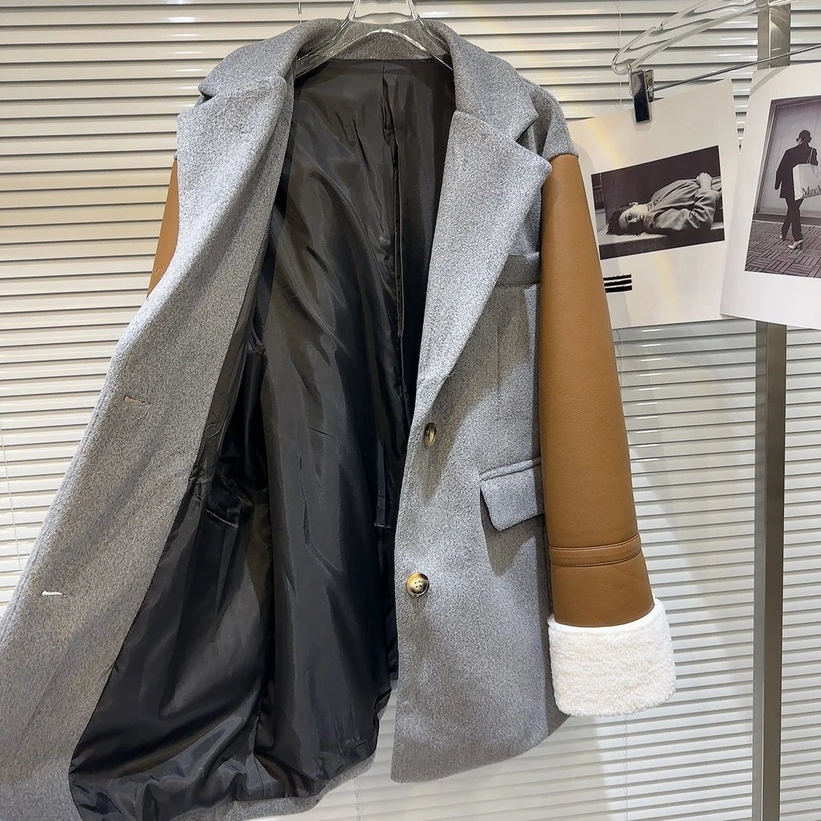 Women Coat Autumn Winter Leather Stitched Shoulder Padded Patchwork Single Breasted Loose Long Ladies Jacket New