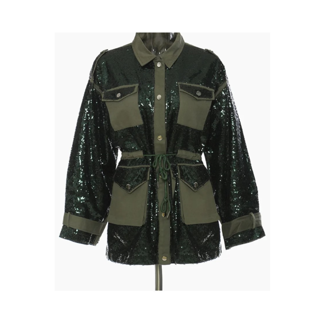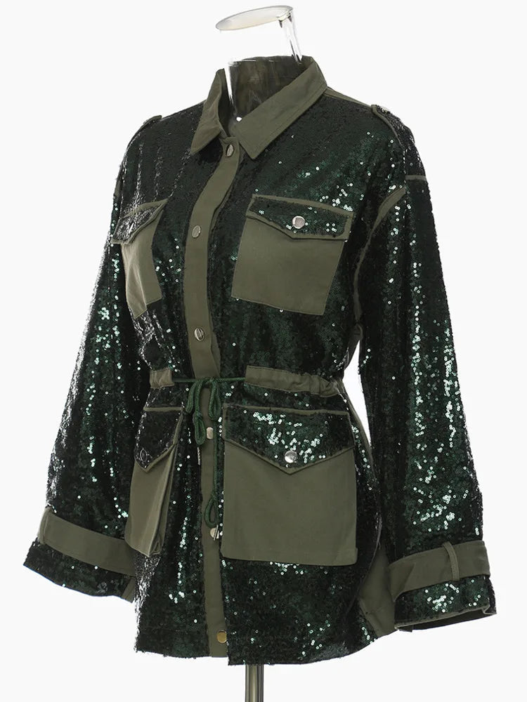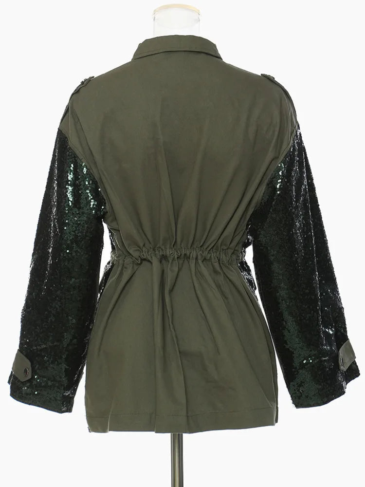 This single-breasted jacket boasts an adjustable drawstring waist for a comfortable fit. The stylish spliced sequins add a touch of glamour to any outfit.