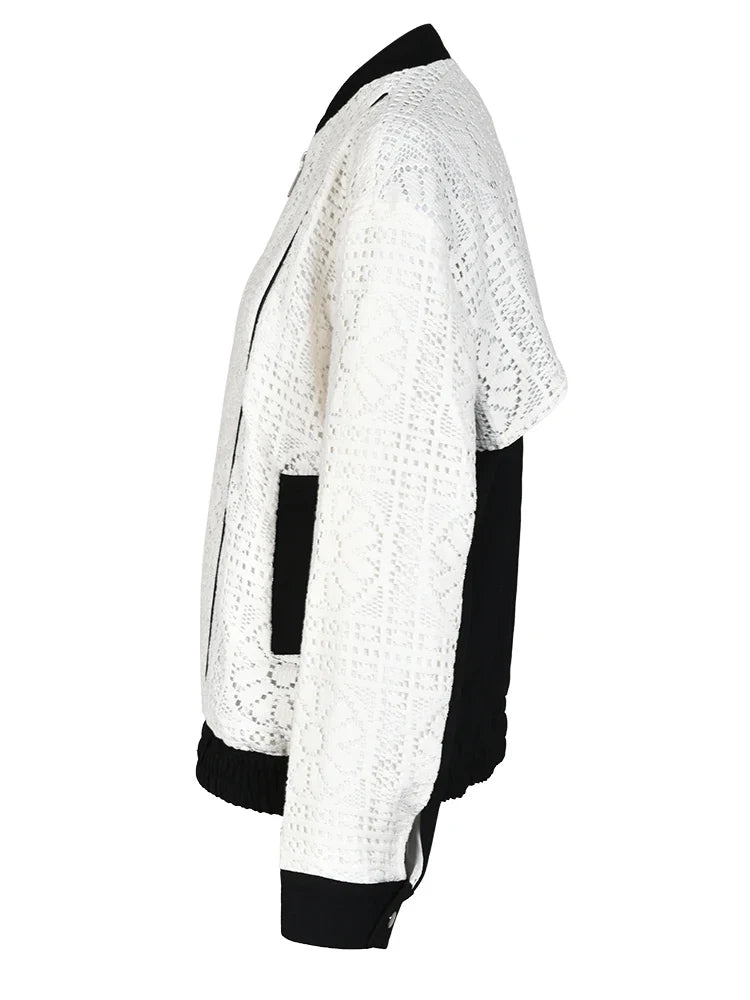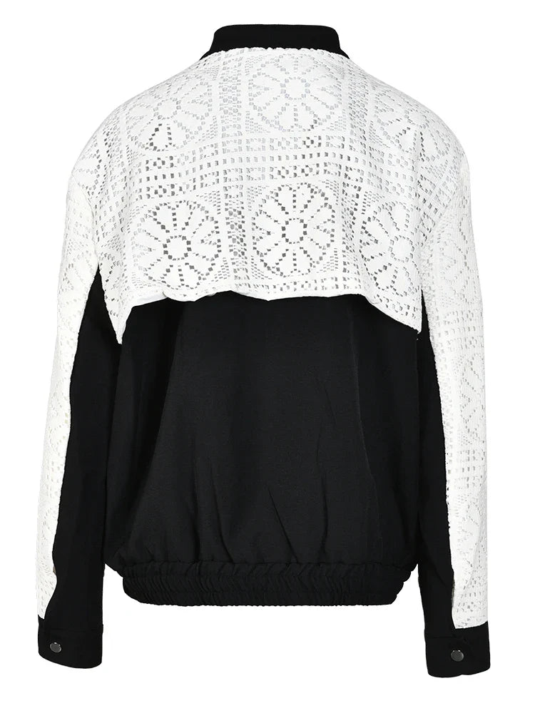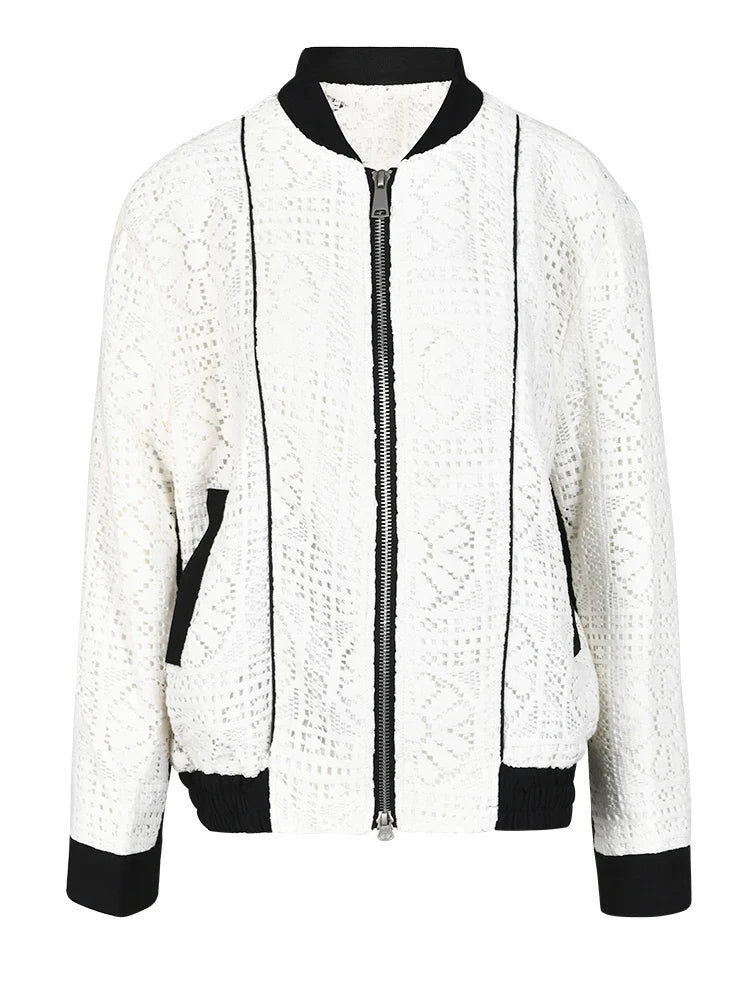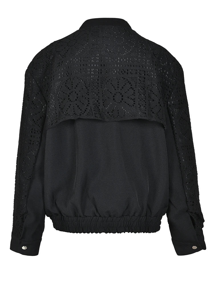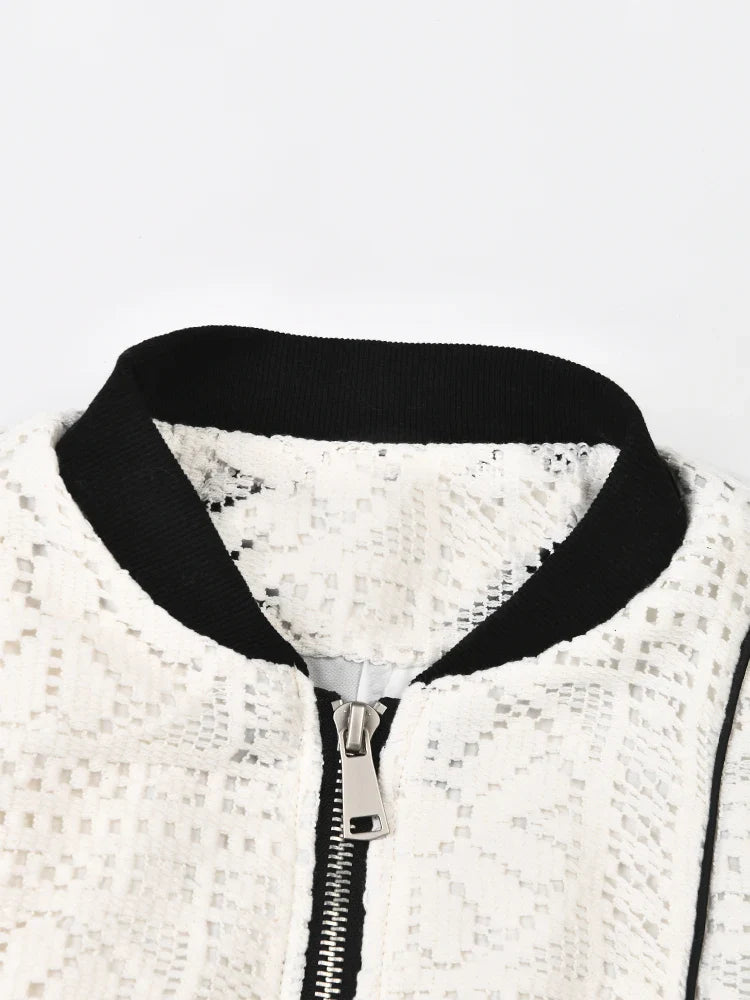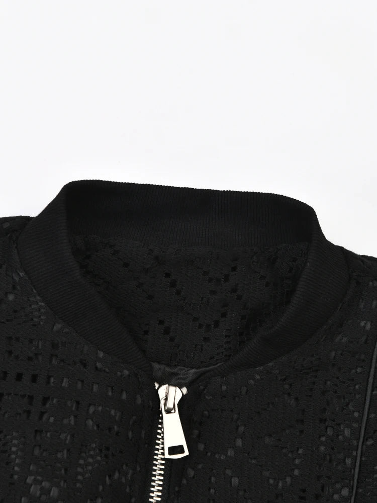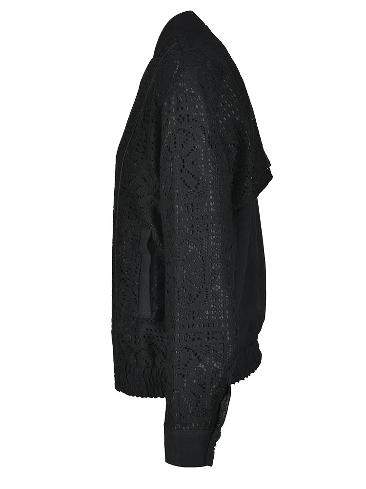 The intricate hollow out design adds a touch of sophistication to this classic stand collar jacket. Made with knitted fabric. it offers both comfort and durability.