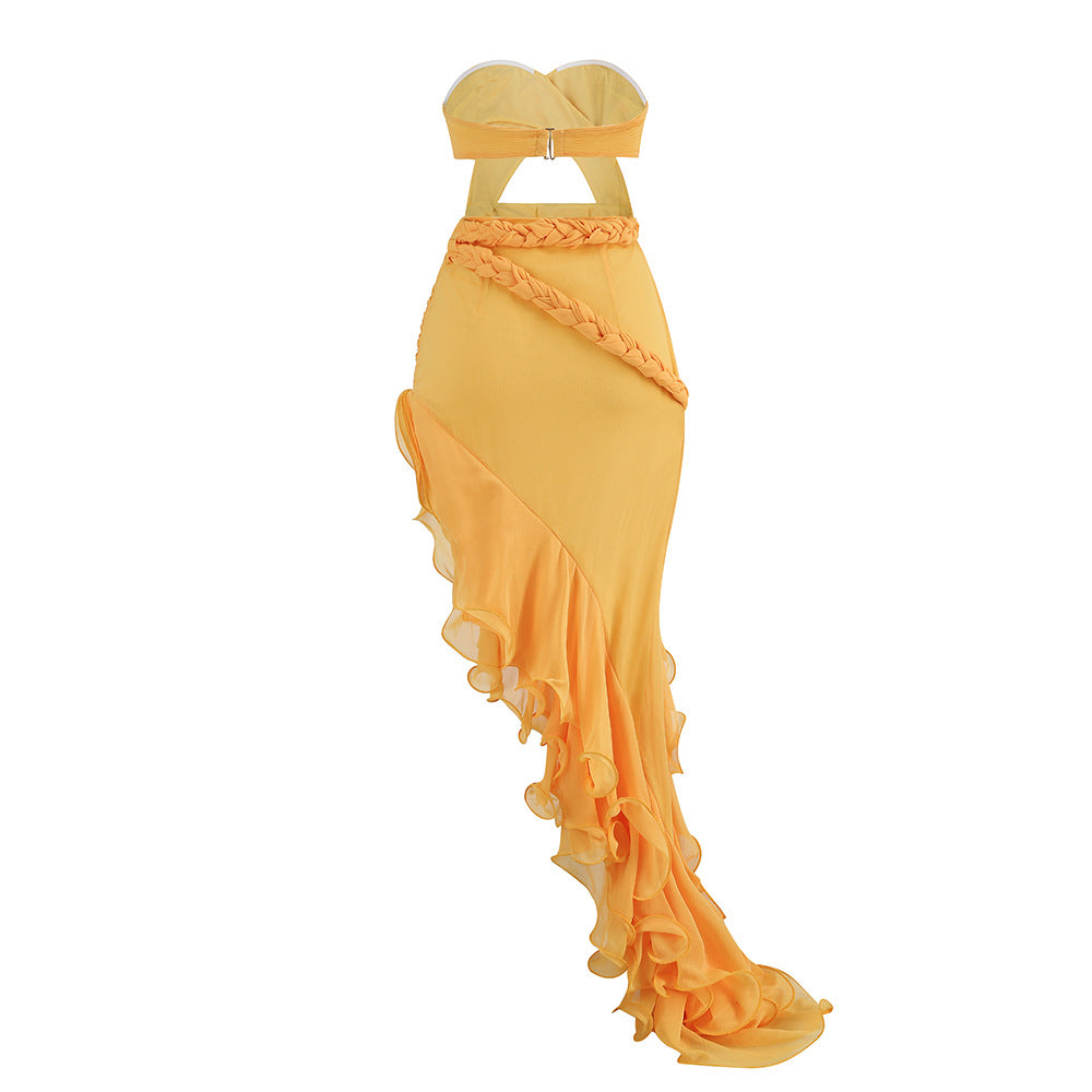 This stylish dress features a strapless design for a flattering slim fit. with braided cut outs and ruffle edges adding a unique touch. Perfect for any occasion. this dress will make you feel confident and stylish.