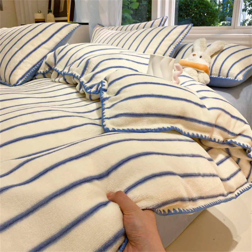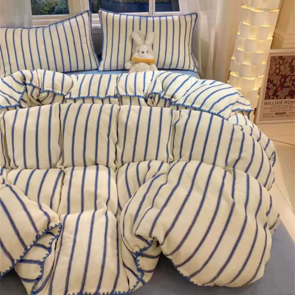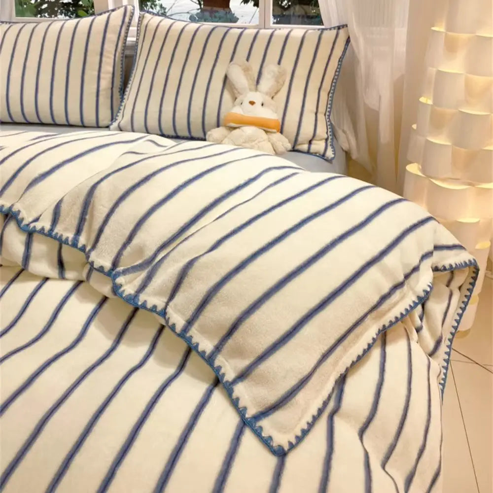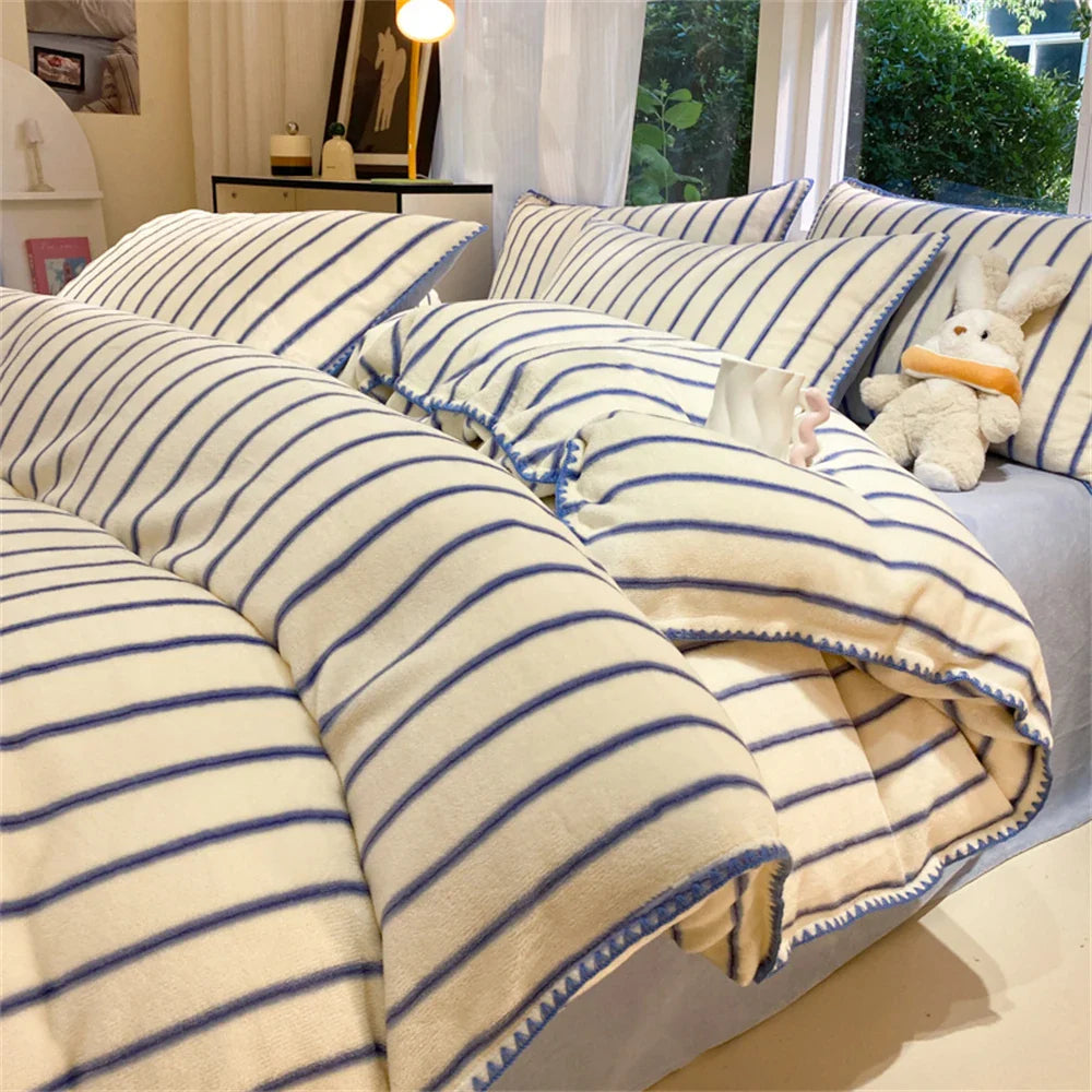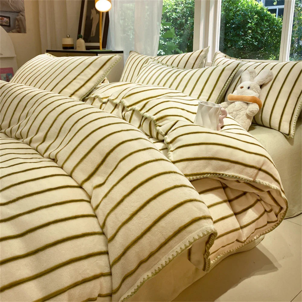 Stripe Milk Velvet Bedding Set Queen Thickened Duvet Cover Set Bedroom Decor Winter 4 Piece Set Quilt Cover Pillowcase Bed Sheet