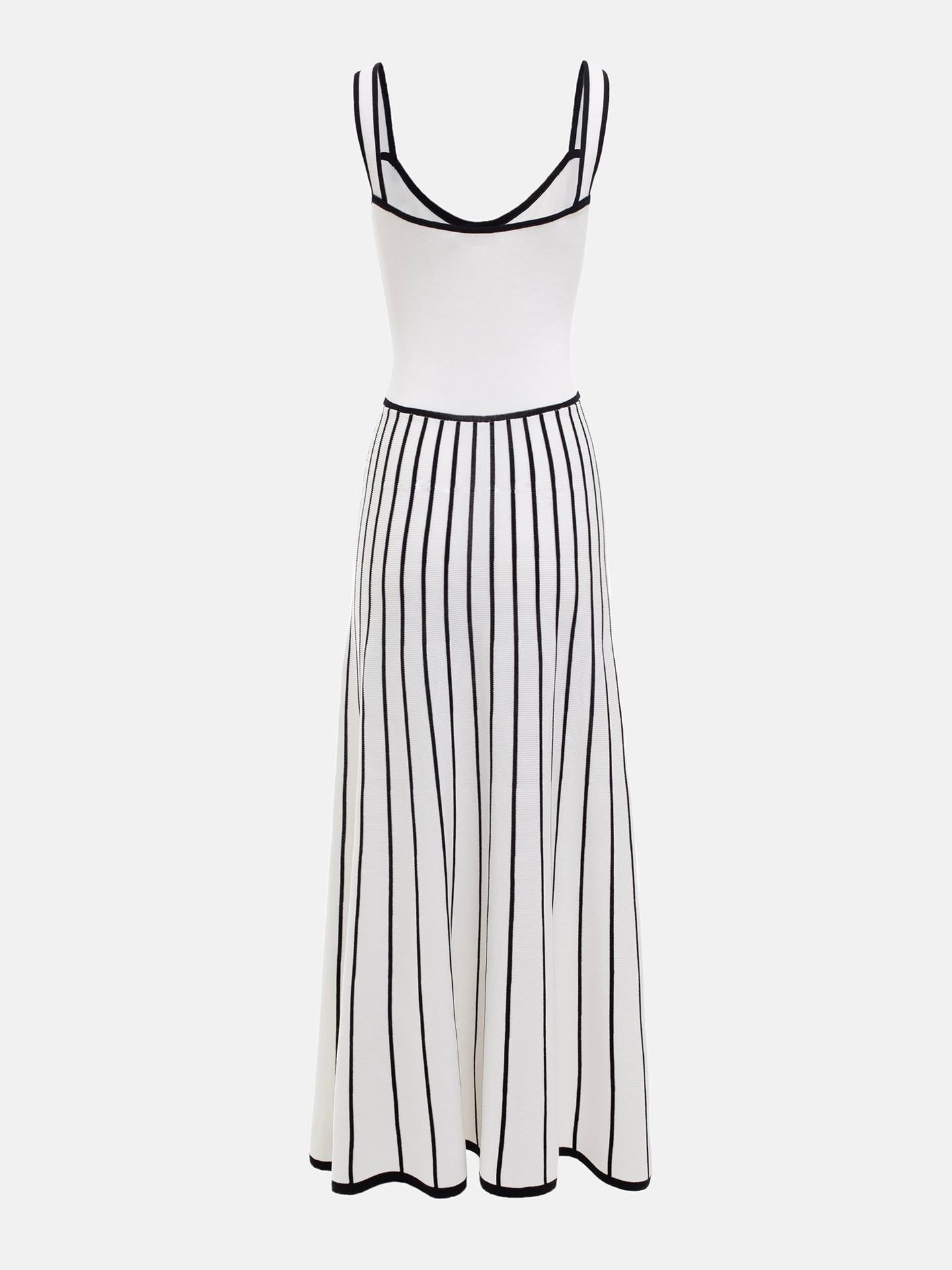 The unique stripes and backless design create a bold yet feminine look. Made with knitted fabric. this dress offers both comfort and durability.