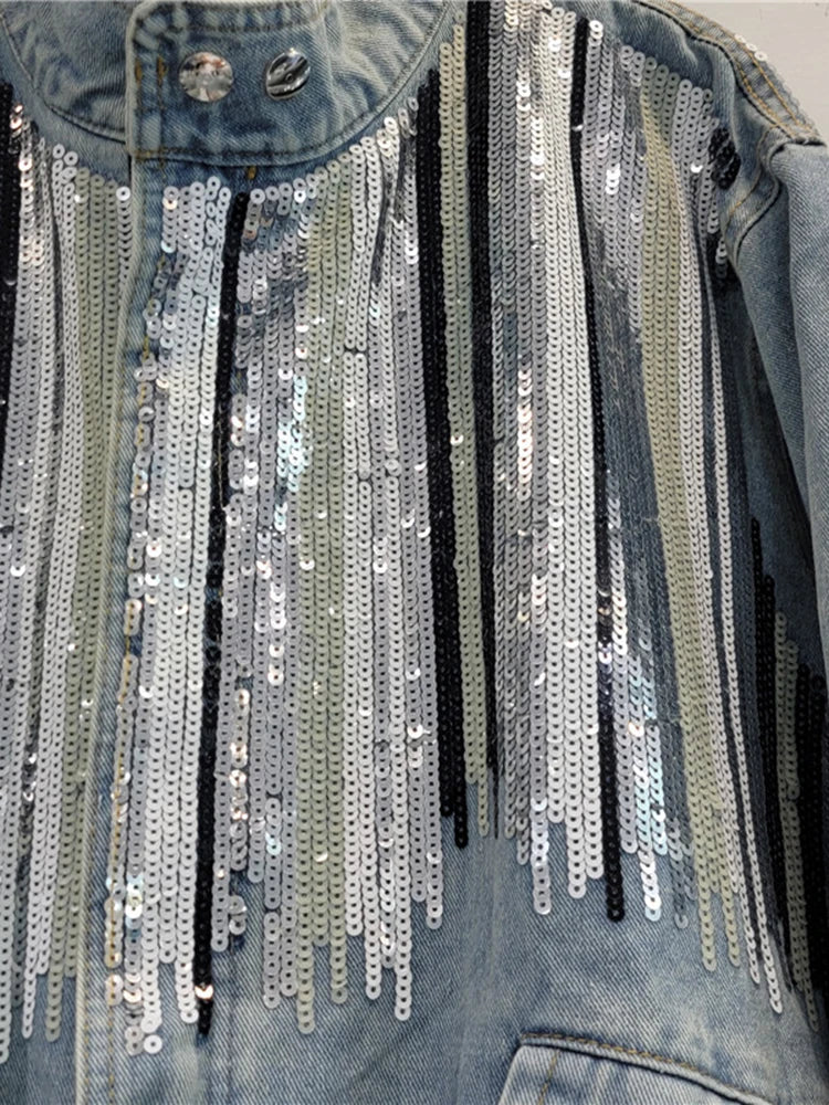Upgrade your wardrobe with this stylish Striped Sequins Long Sleeve Loose Denim Jacket. The perfect balance of chic and casual. this jacket is adorned with eye-catching striped sequins and designed with a loose fit for ultimate comfort.