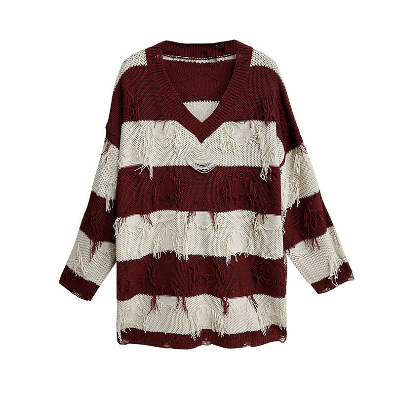 Expertly crafted with a V-neck design and stylish stripes. this knitted sweater features trendy tassels for an eye-catching look. Made with loose-knit fabric for a comfortable and relaxed fit.