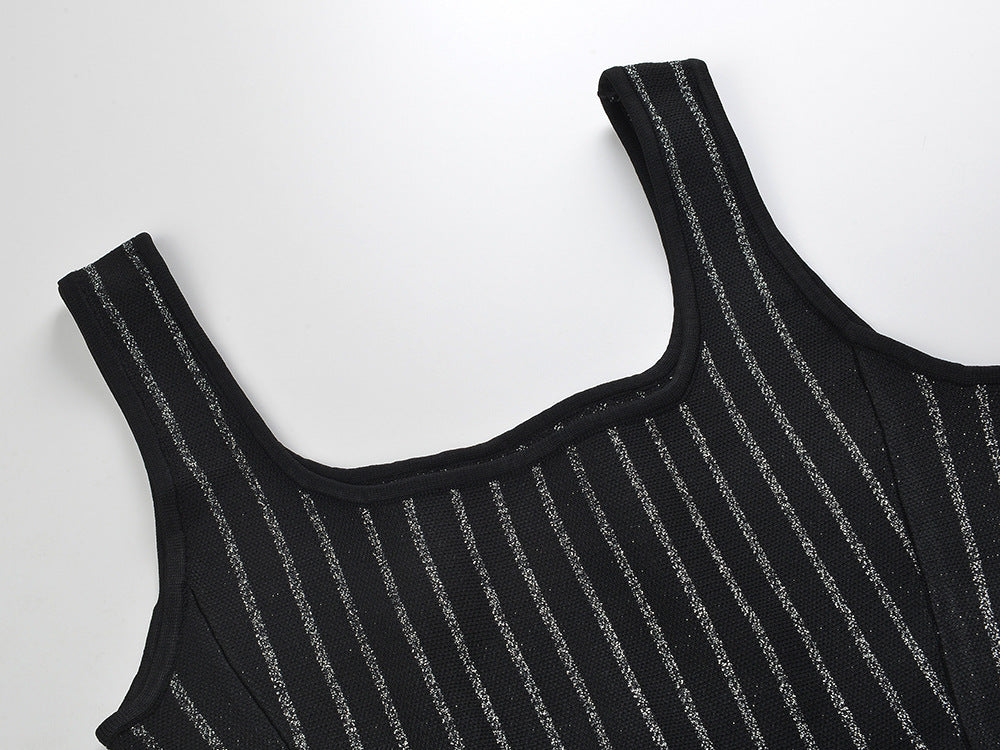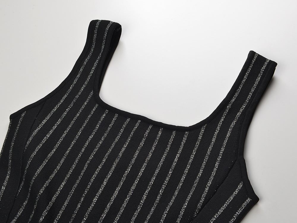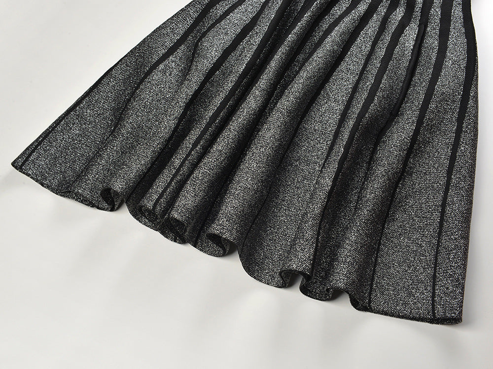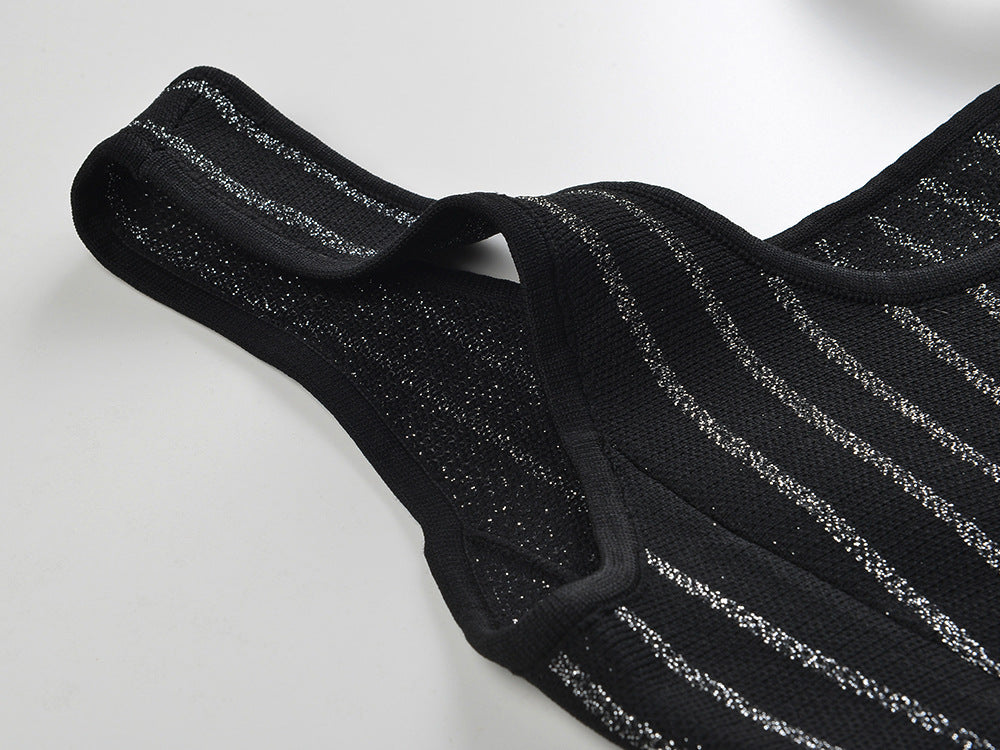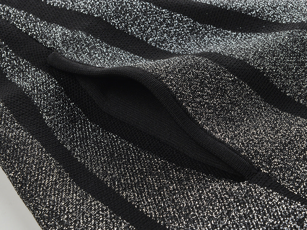 This Stripes Silver Sparkling Knitted Sleeveless Dress adds just the right amount of shimmer to your wardrobe. With its elegant silver stripes and comfortable knitted design. it's perfect for any occasion.