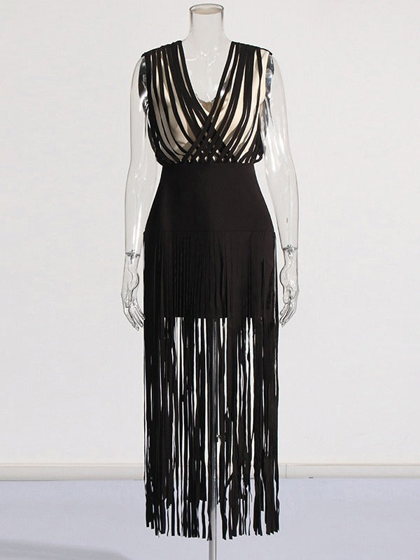 Expertly designed and crafted. this dress is the epitome of style and elegance. The deep V-neckline and waist bandage accentuate your figure. while the tassel details add a touch of sophistication.