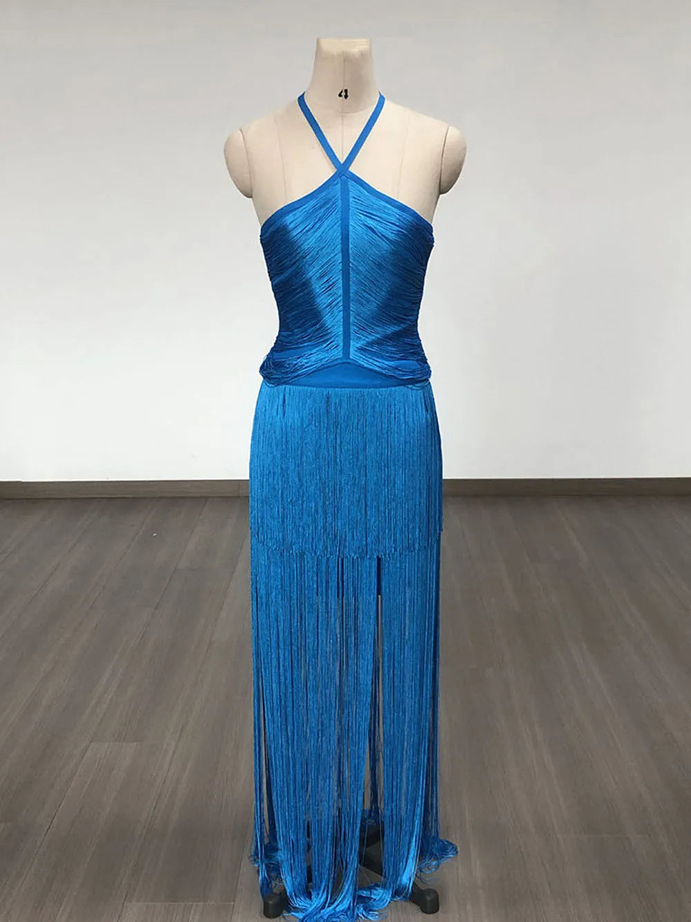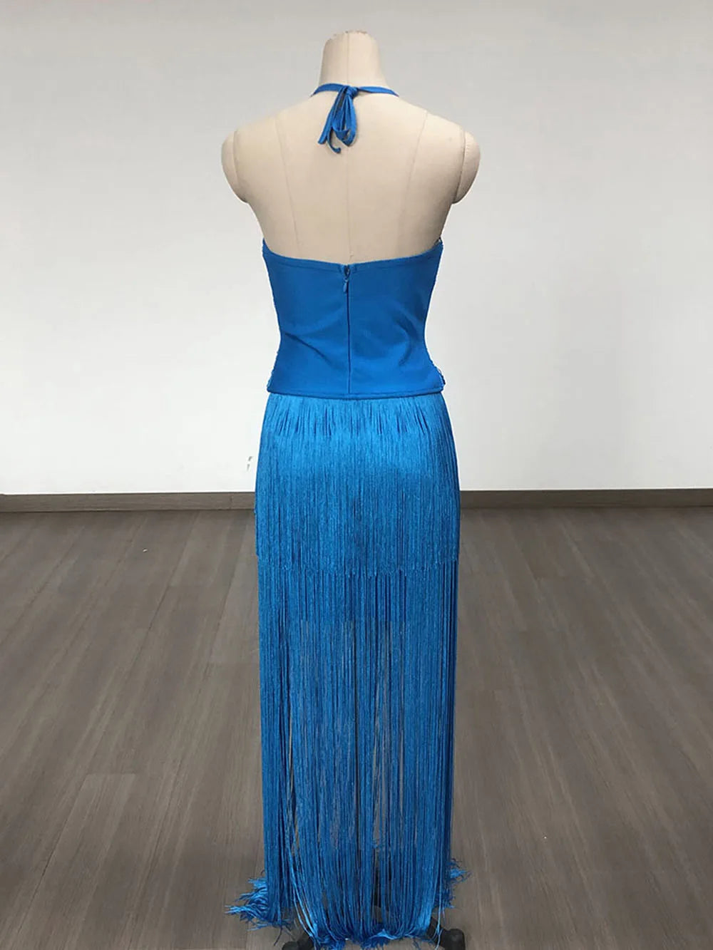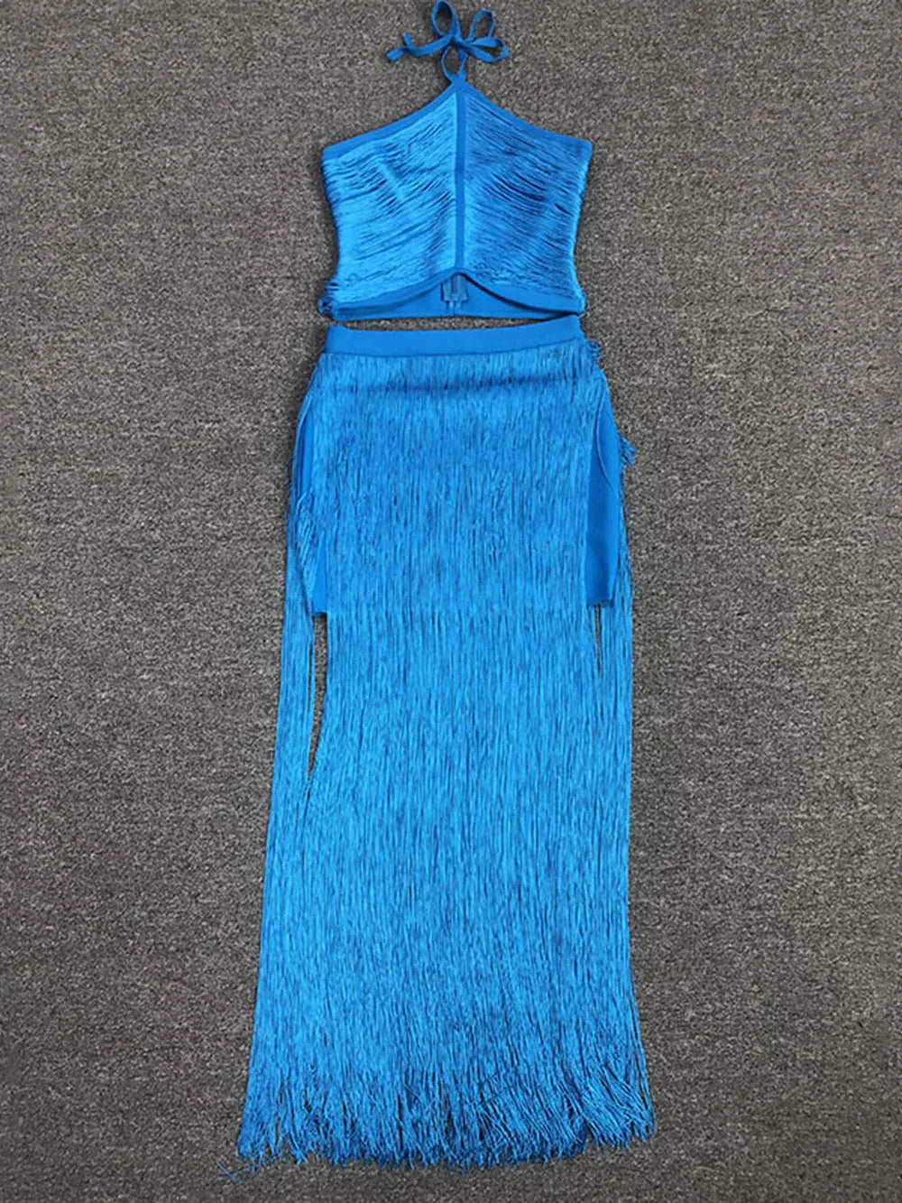This set includes a tassel sleeveless top and a bandage tassel skirt. The tassels add a playful touch to this chic ensemble. while the bandage material provides a flattering and comfortable fit.