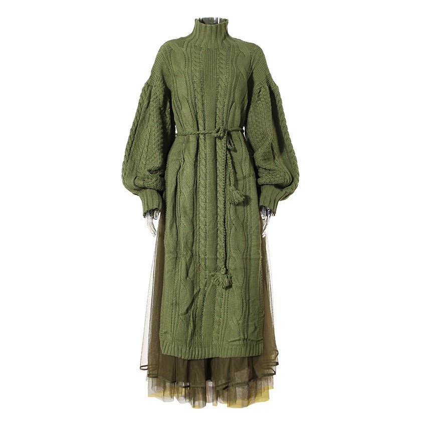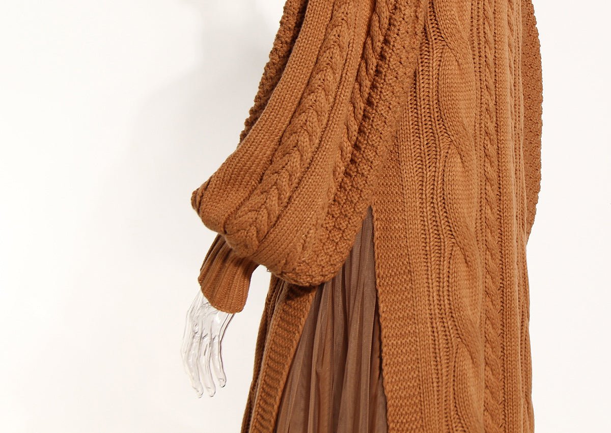 Embrace sophisticated comfort with this Knit Sweater and Tulle Skirt Set. combining the warmth of a cable-knit sweater with the feminine charm of a flowing tulle skirt. The set features an oversized high-neck sweater with beautiful cable knit details. belted at the waist to create a flattering silhouette. The sheer tulle underlay adds an unexpected. elegant twist to the look. making this set perfect for both casual and special occasions. Available in a versatile camel color. this outfit can effortlessly transition between different settings.