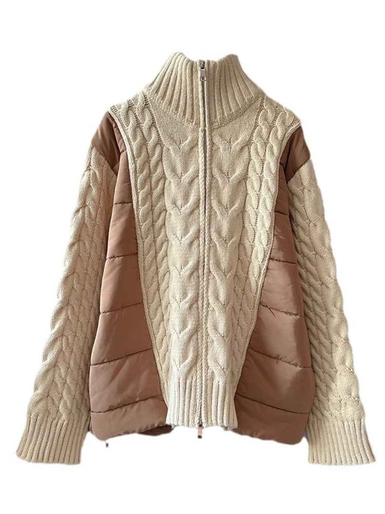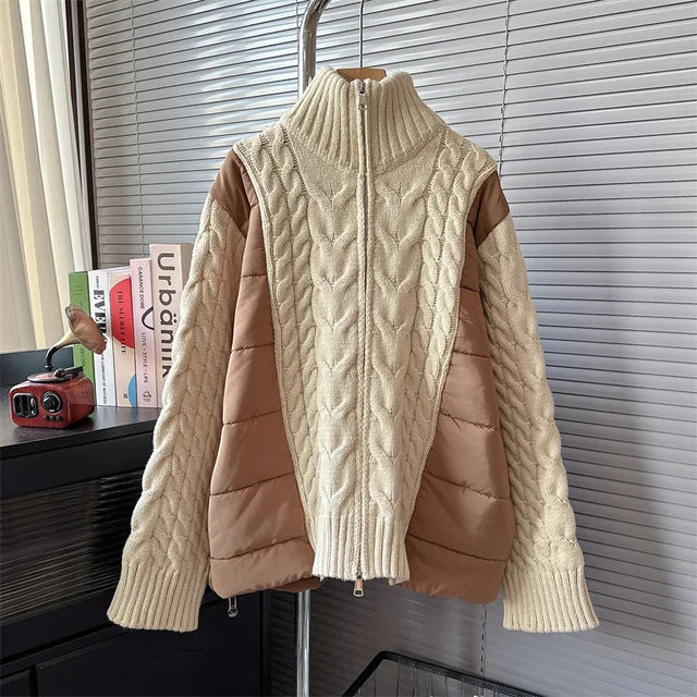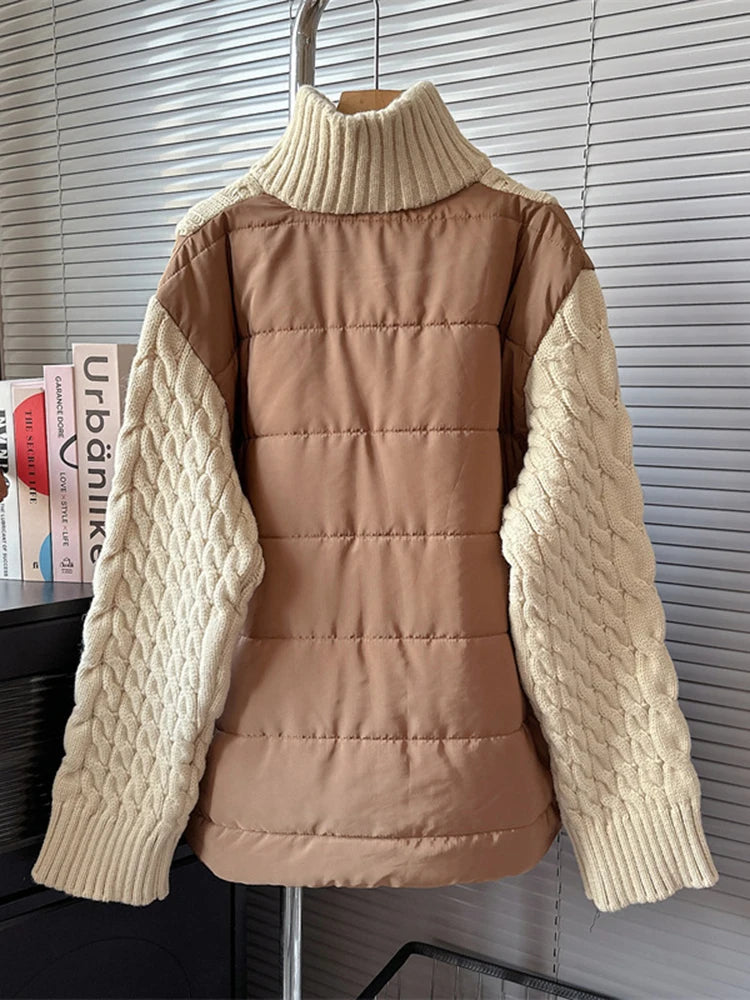 The turtleneck design and cotton padding offer excellent insulation. making it perfect for the colder months. The patchwork detailing adds a unique touch. making this sweater a must-have for any fashion-forward individual.
